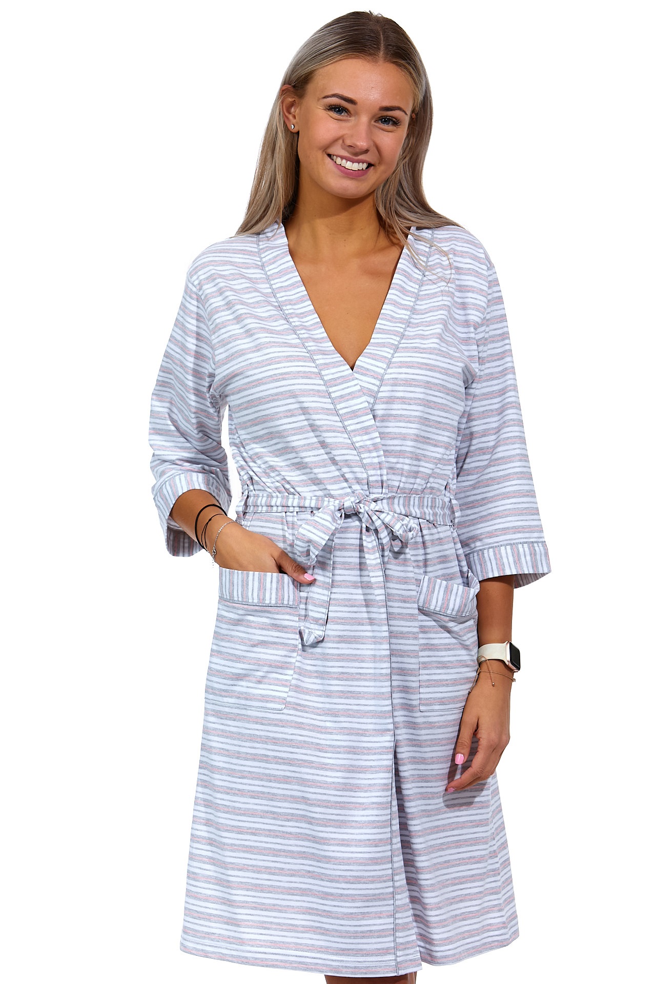 Šedý i růžový pruhovaný dámský župan 1G0477
