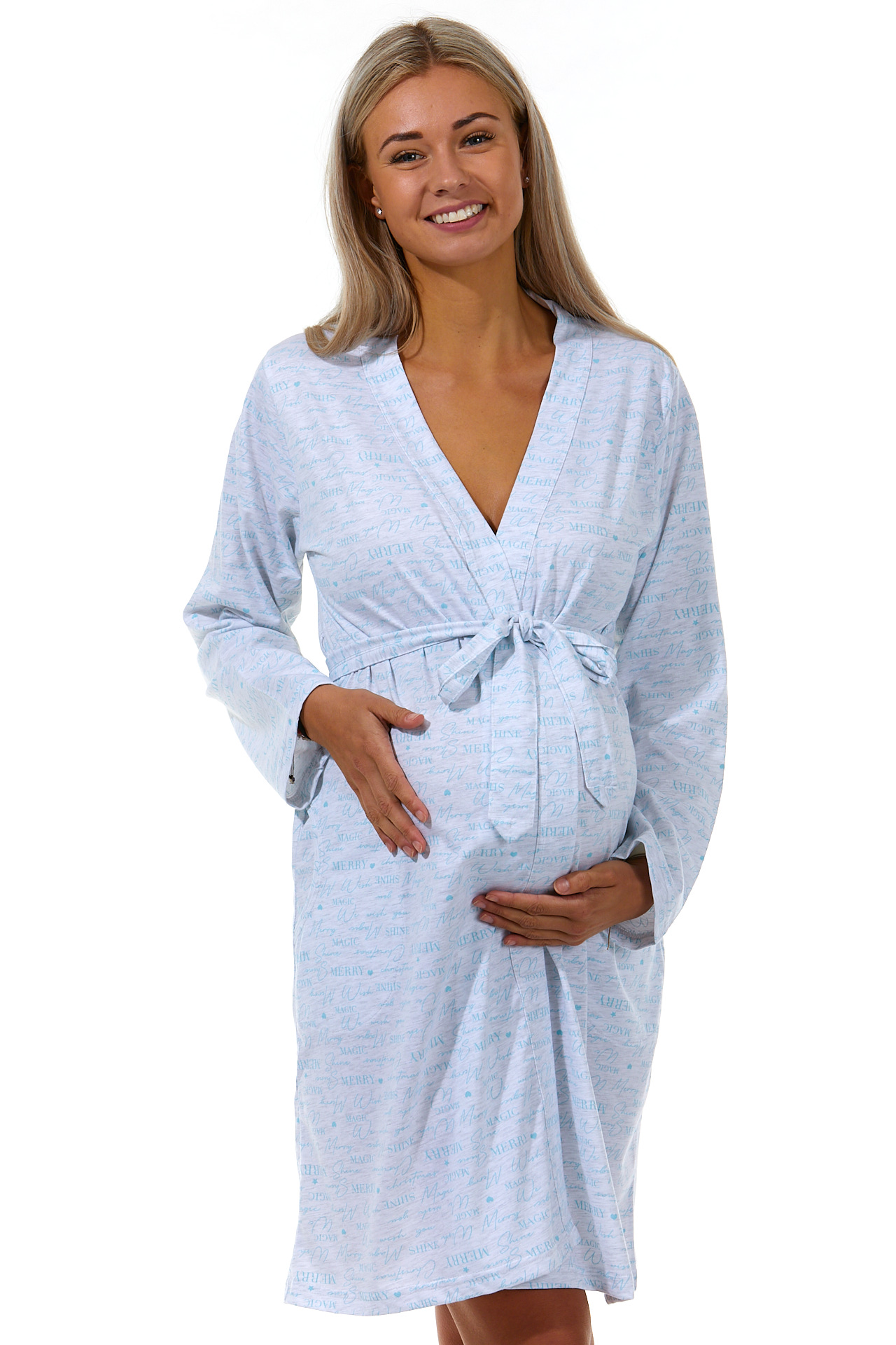 Šedý i modrý celo nápisový lehký těhotenský i kojící župan Merry Magic
