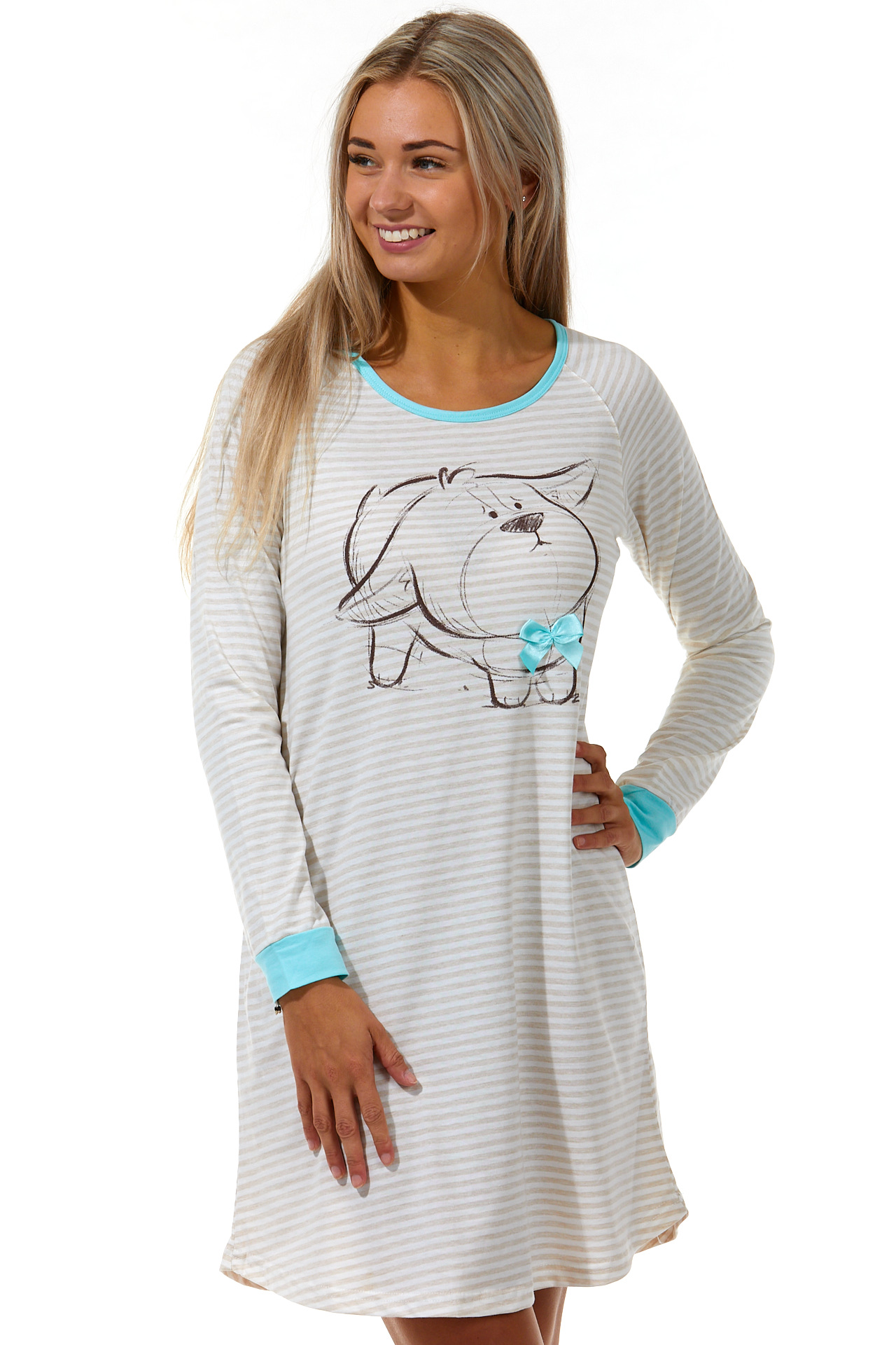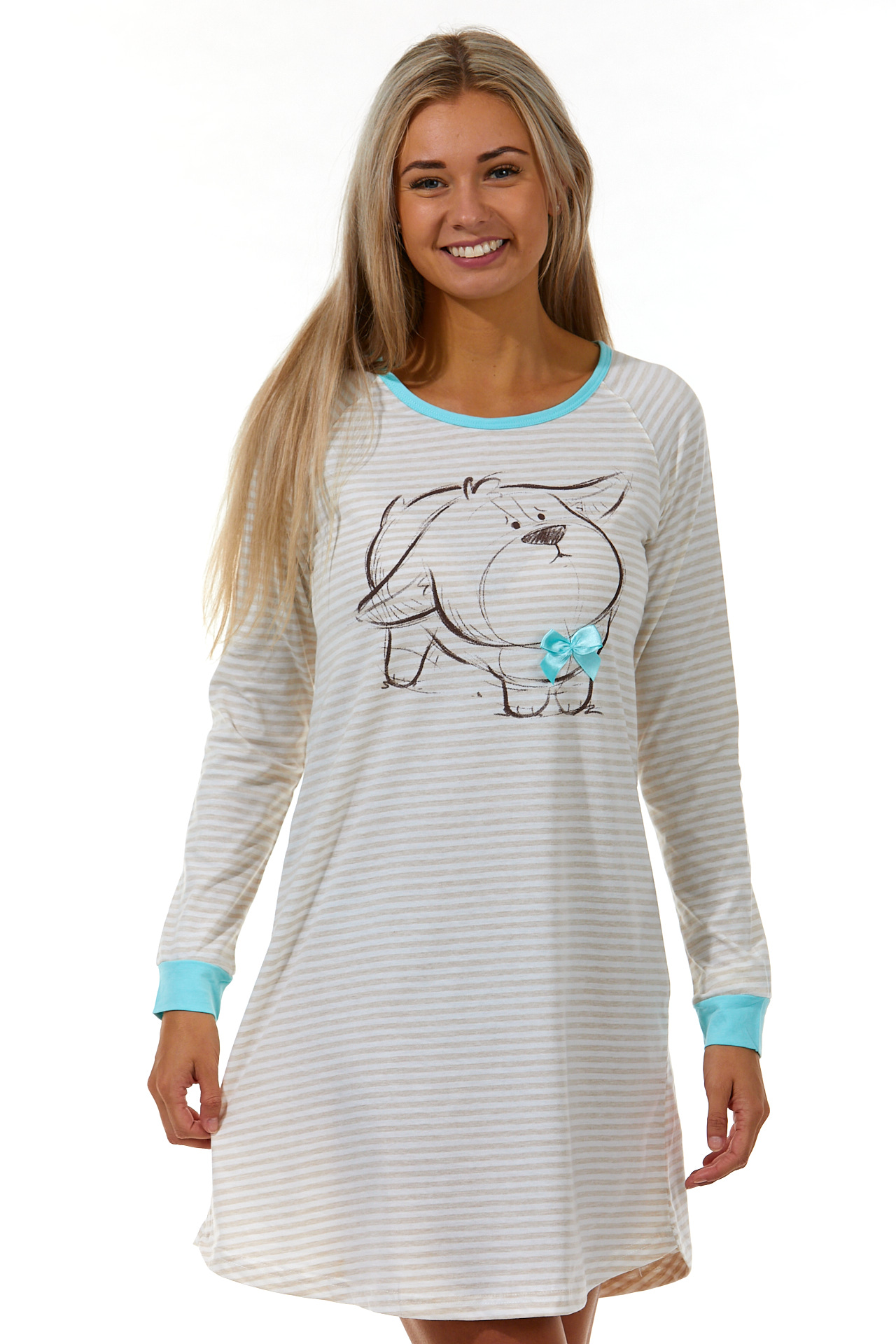 Béžová pruhovaná noční košile pro ženy i dívky s dlouhým rukávem a pejskem