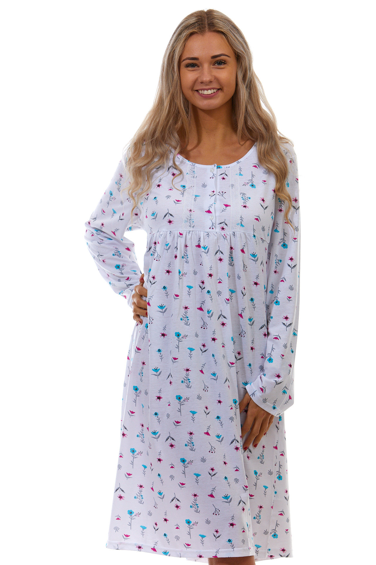 Bílá a azurově i růžově květovaná noční košile v dlouhé délce pro plnoštíhlou ženu