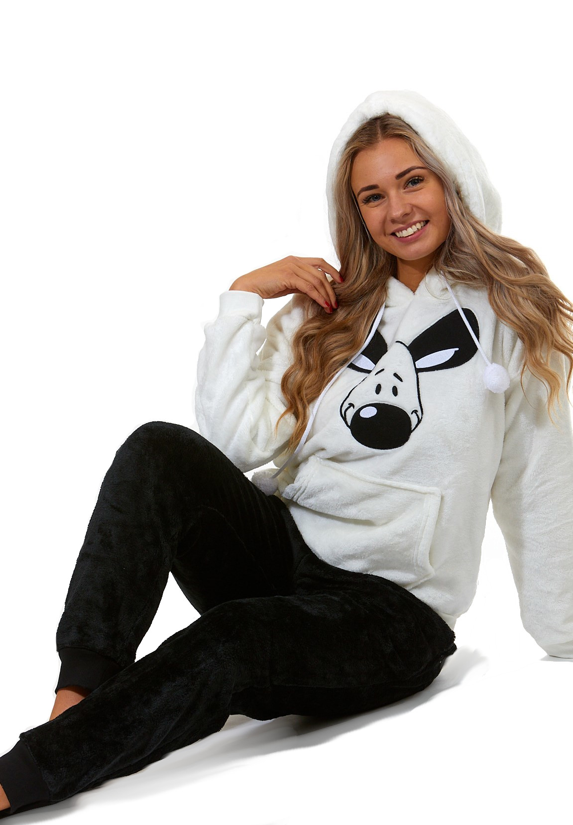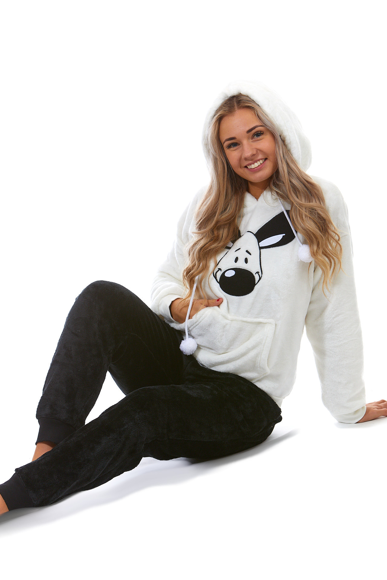 Bílé i černé extra teplé huňaté pyžamo s kapucí pro ženy a dívky, Roztomilý pejsek