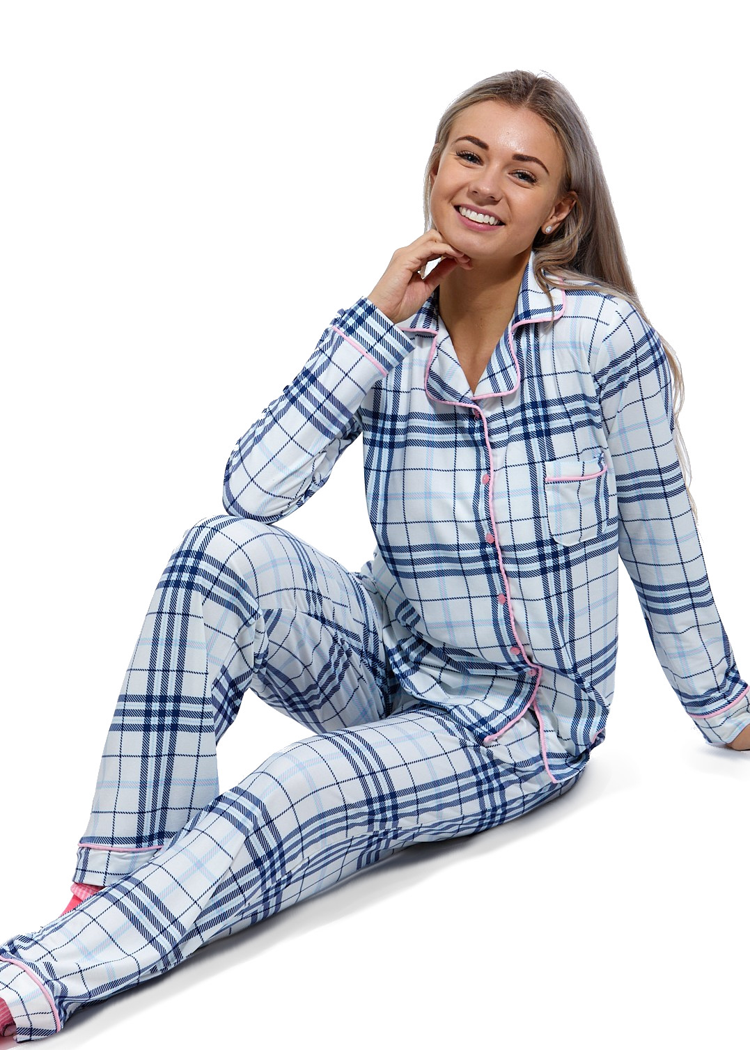 Bílé i modře kárované elegantní extra jemné pyžamo celopropínací pro ženy či dívky