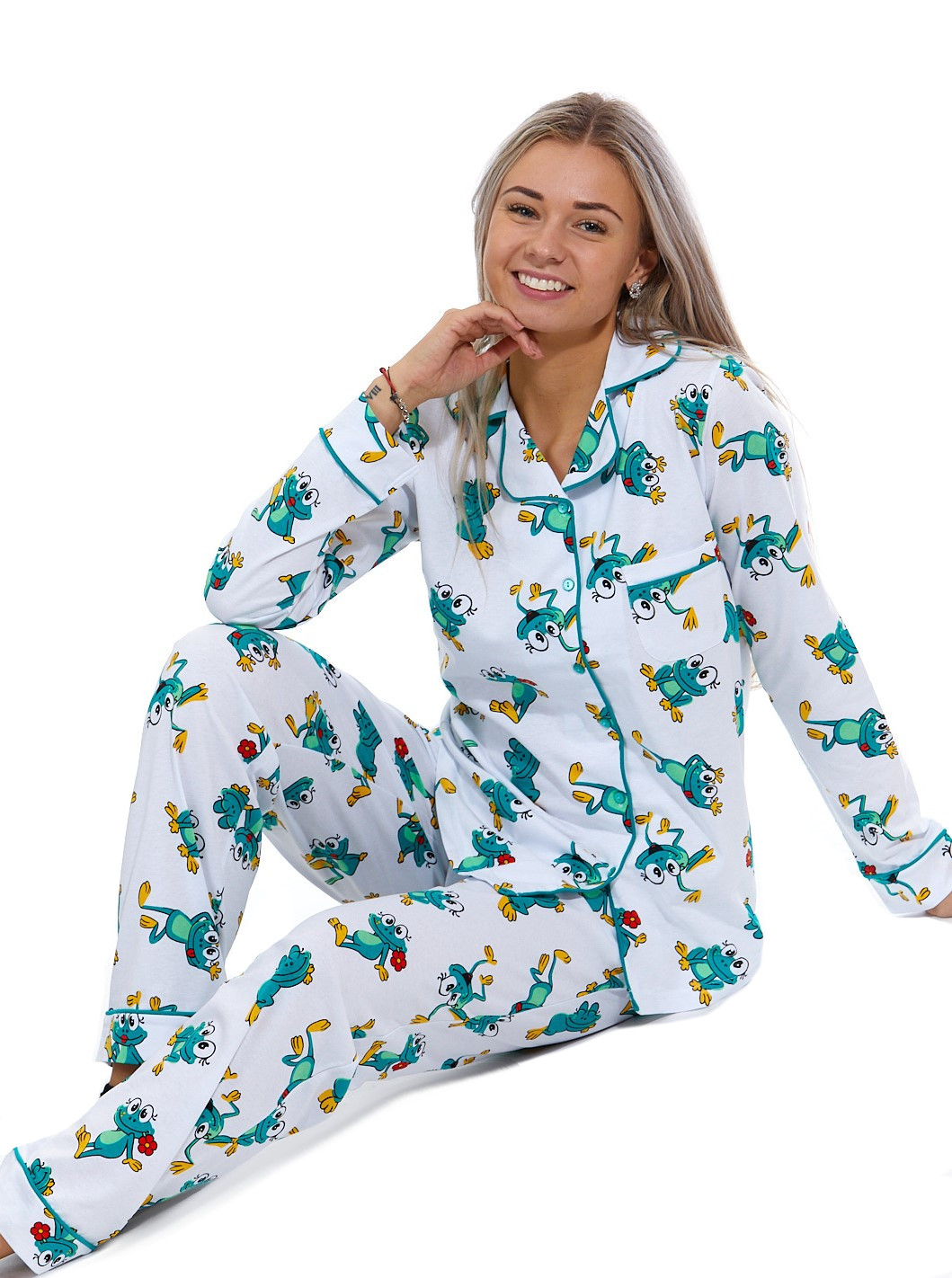 Bílé i zelené veselé elegantní celopropínací pyžamo pro ženy či dívky ŽABÁCI A ŽABIČKY