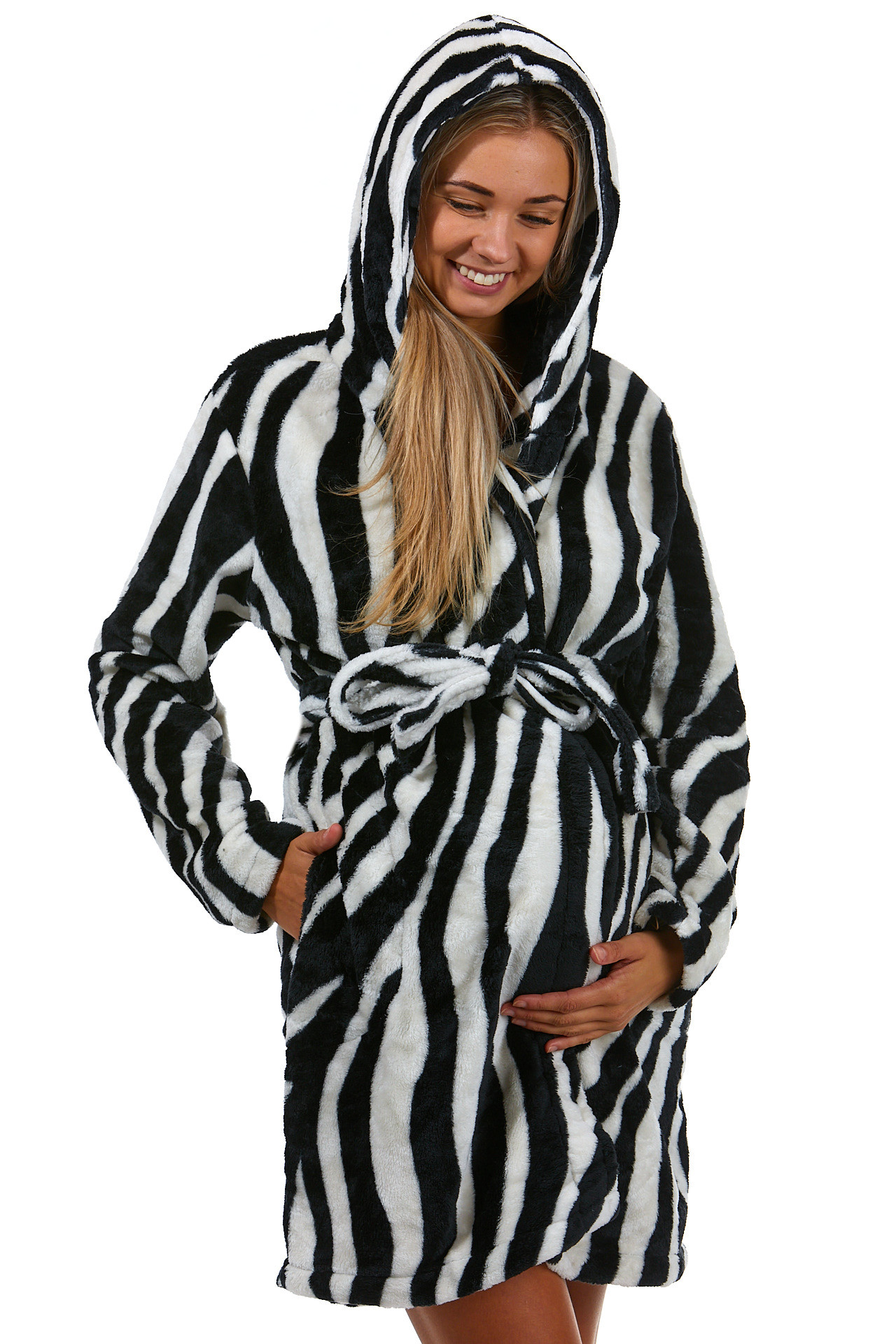 Černobílý těhotenský i kojící huňatý župan s kapucí zebra vzor