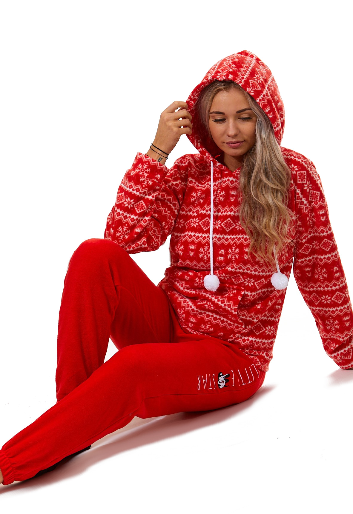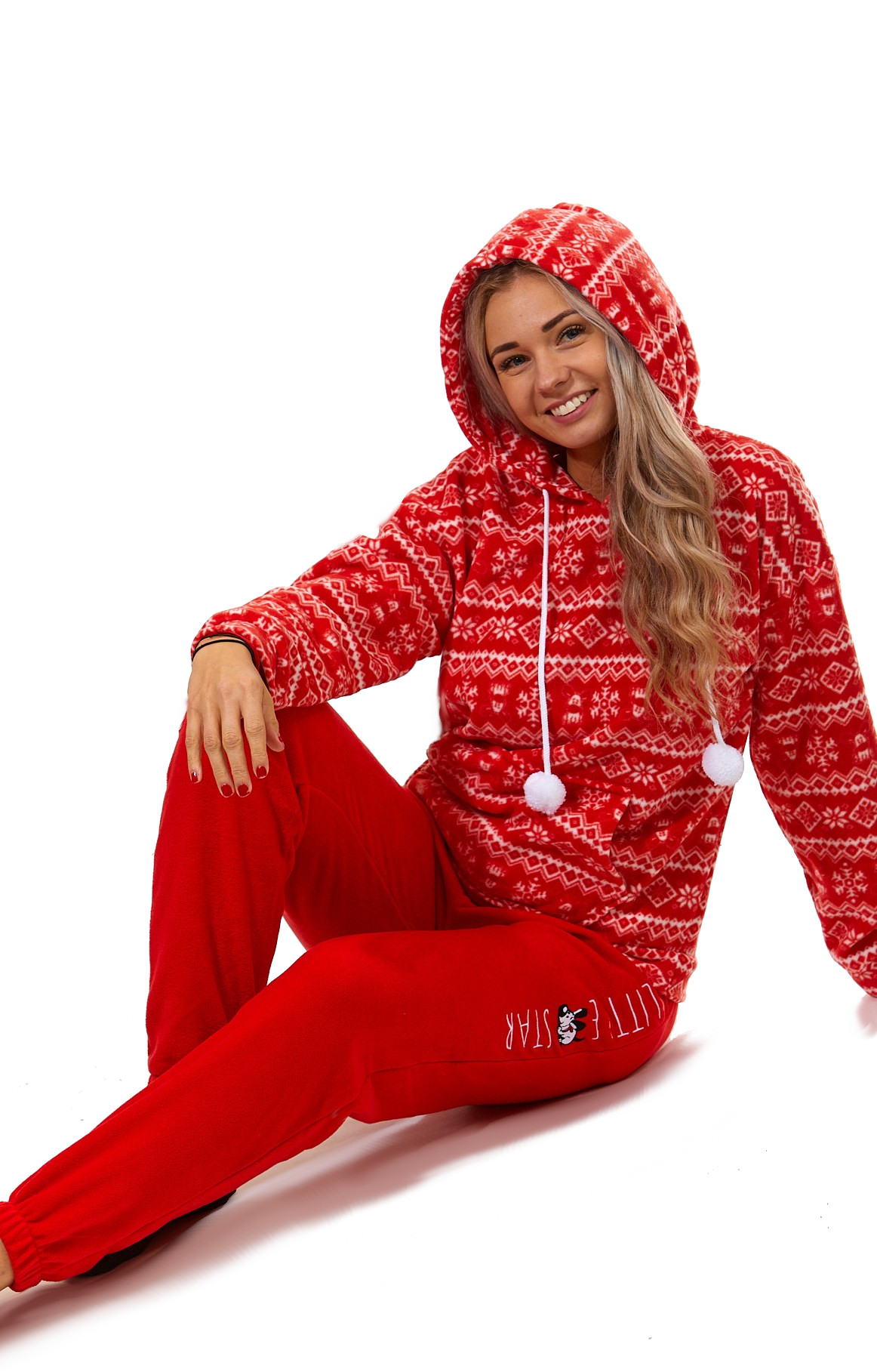 Červené i bílé luxusní hřejivé dámské pyžamo s kapucí, norským vzorem a pejskem LITTLE STAR
