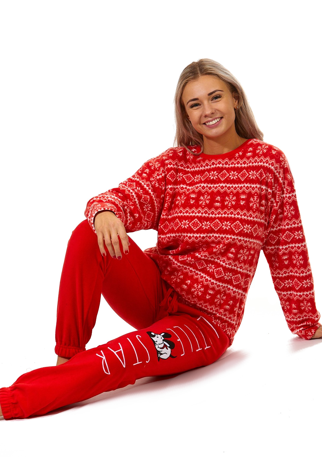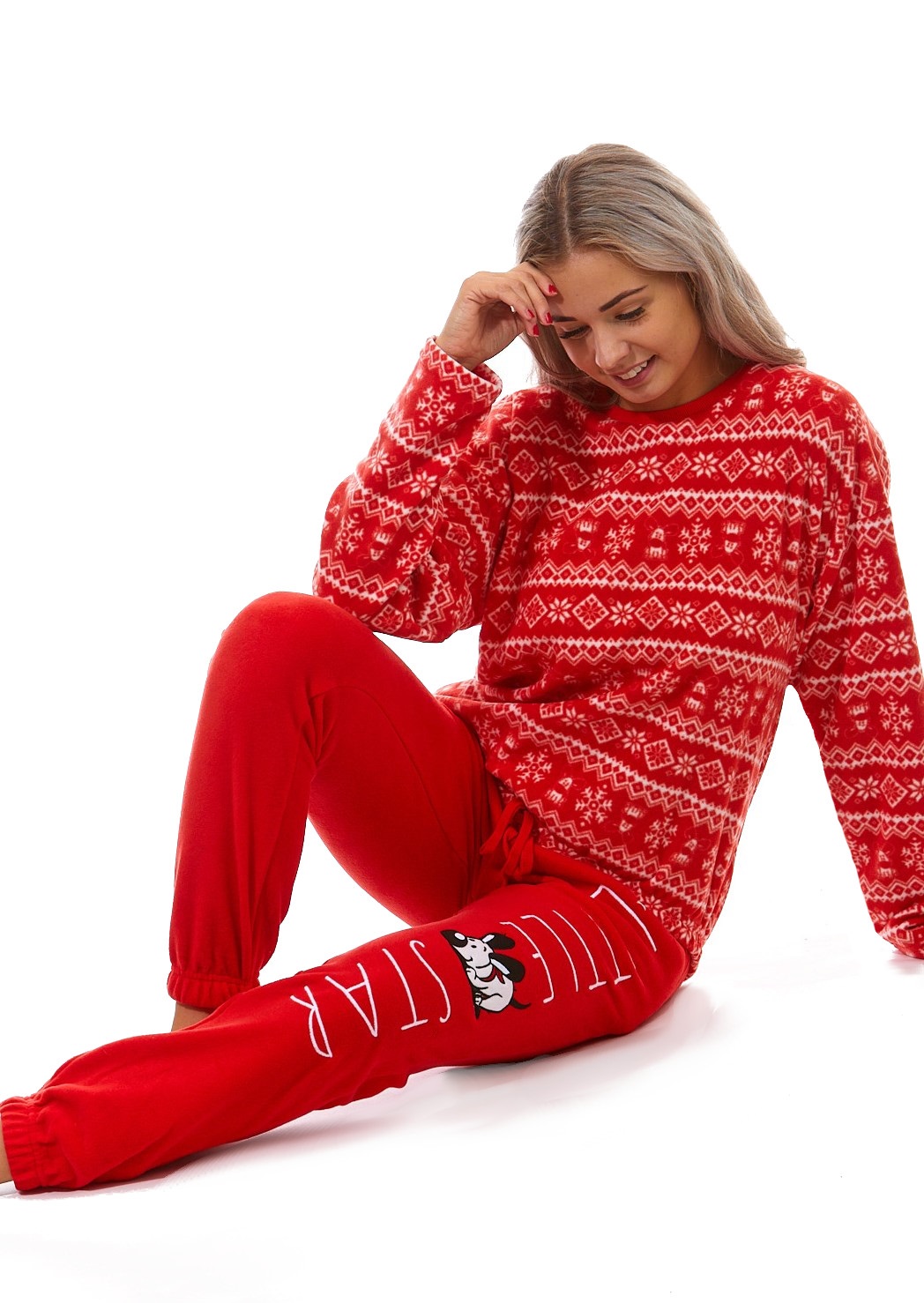 Červené i bílé luxusní hřejivé dámské pyžamo s norským vzorem a pejskem LITTLE STAR