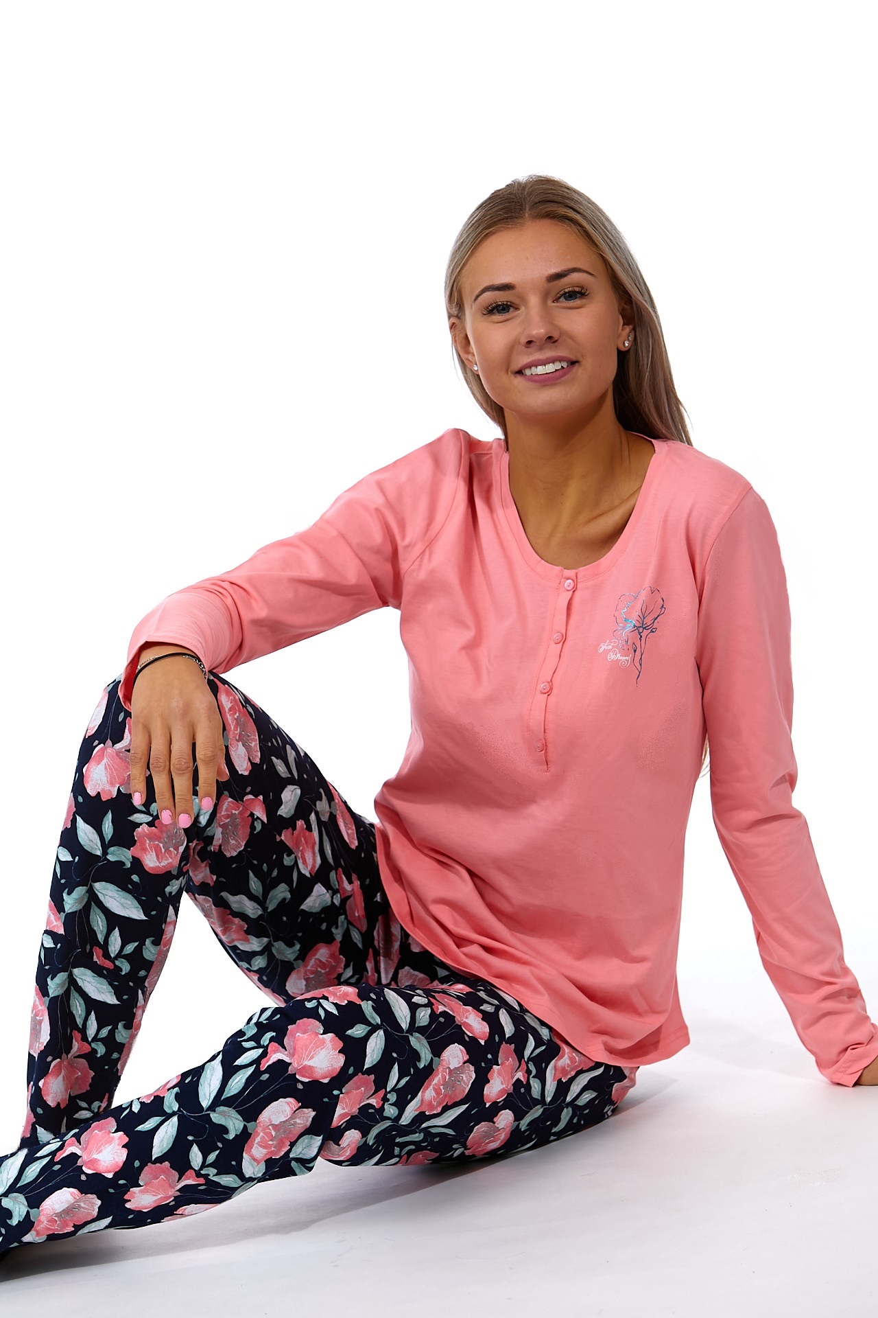 Růžové dámské pyžamo s knoflíky a růžovými květy