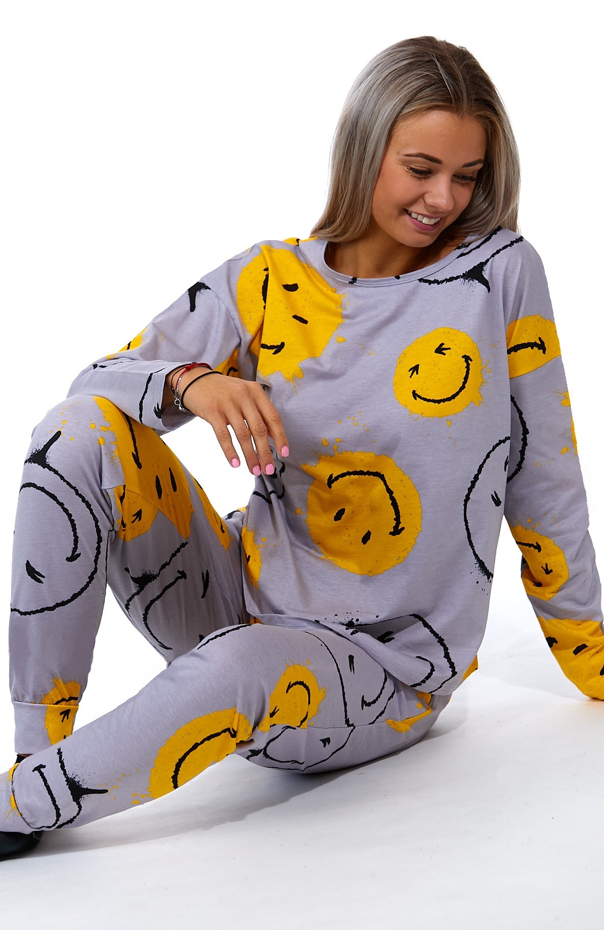Žluté i šedé dámské pyžamo - SMAJLÍCI.