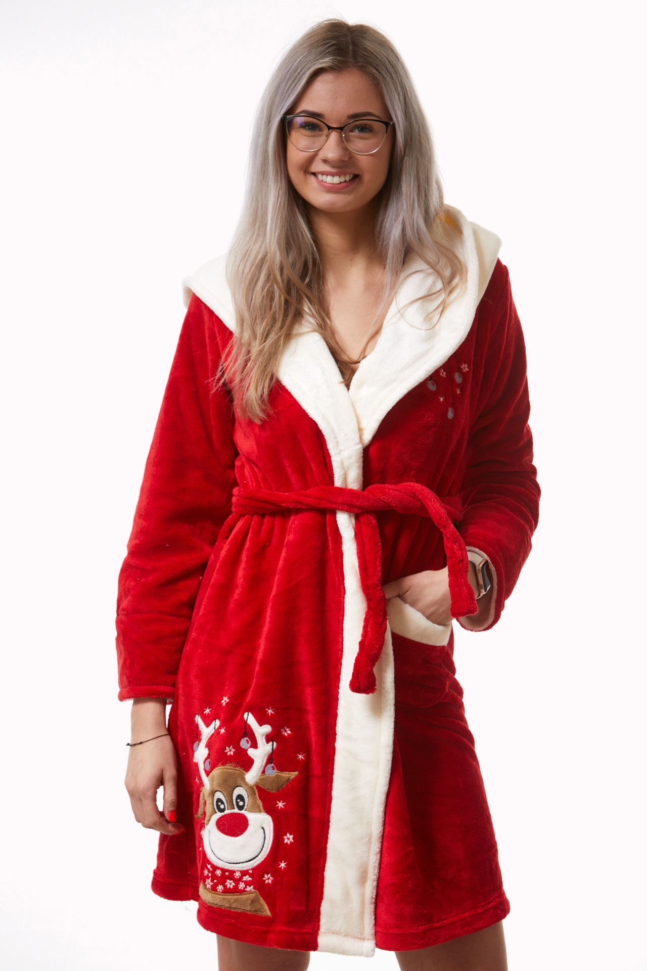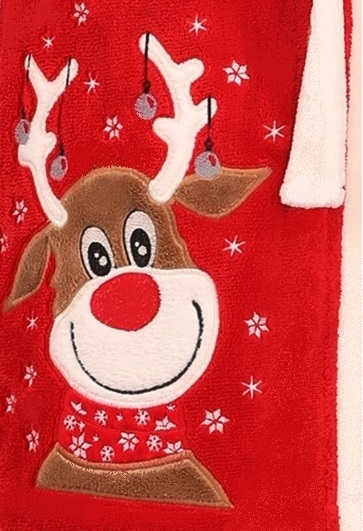 Červený i bílý vánoční huňatý dámský župan se Sobem