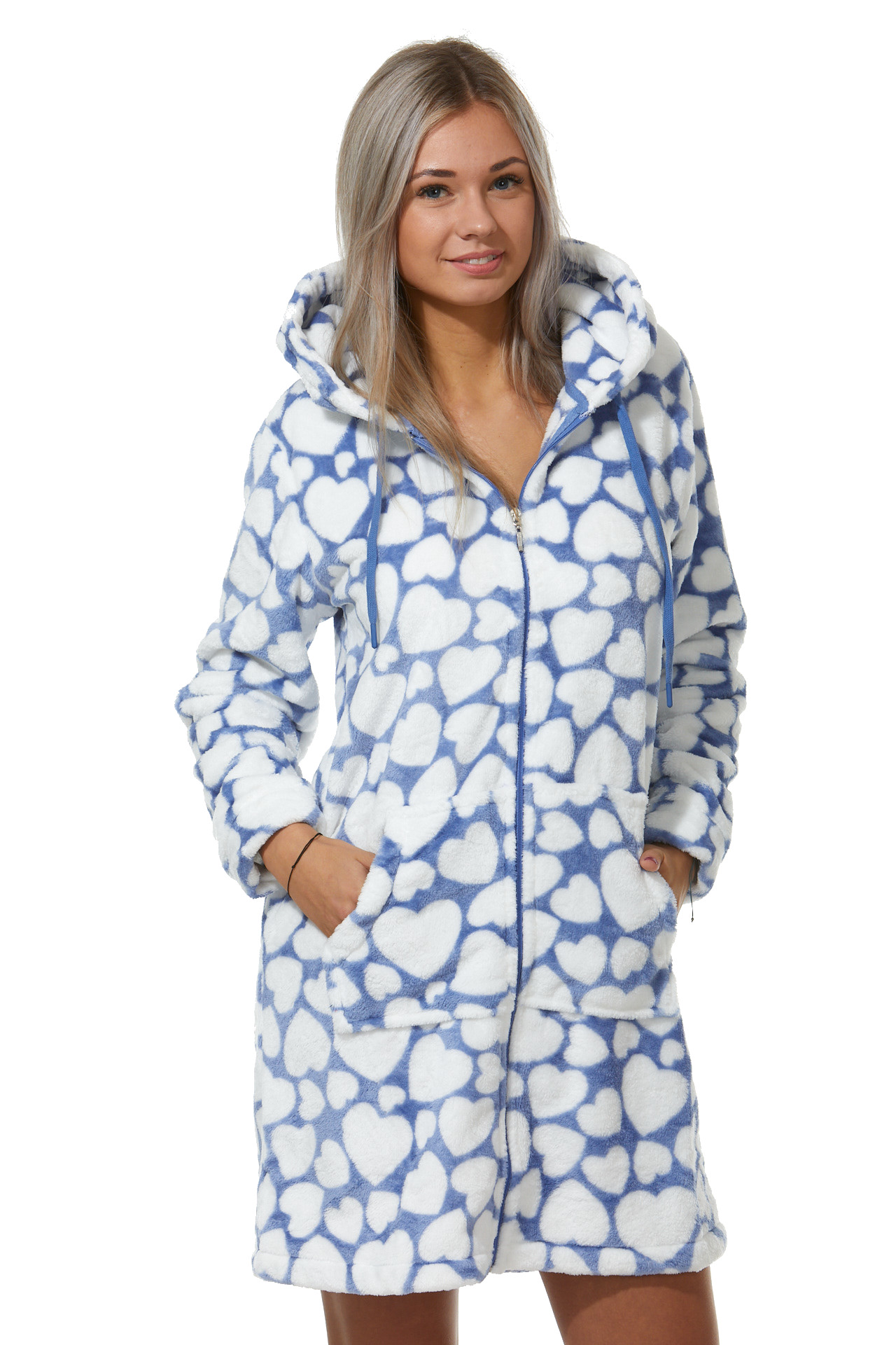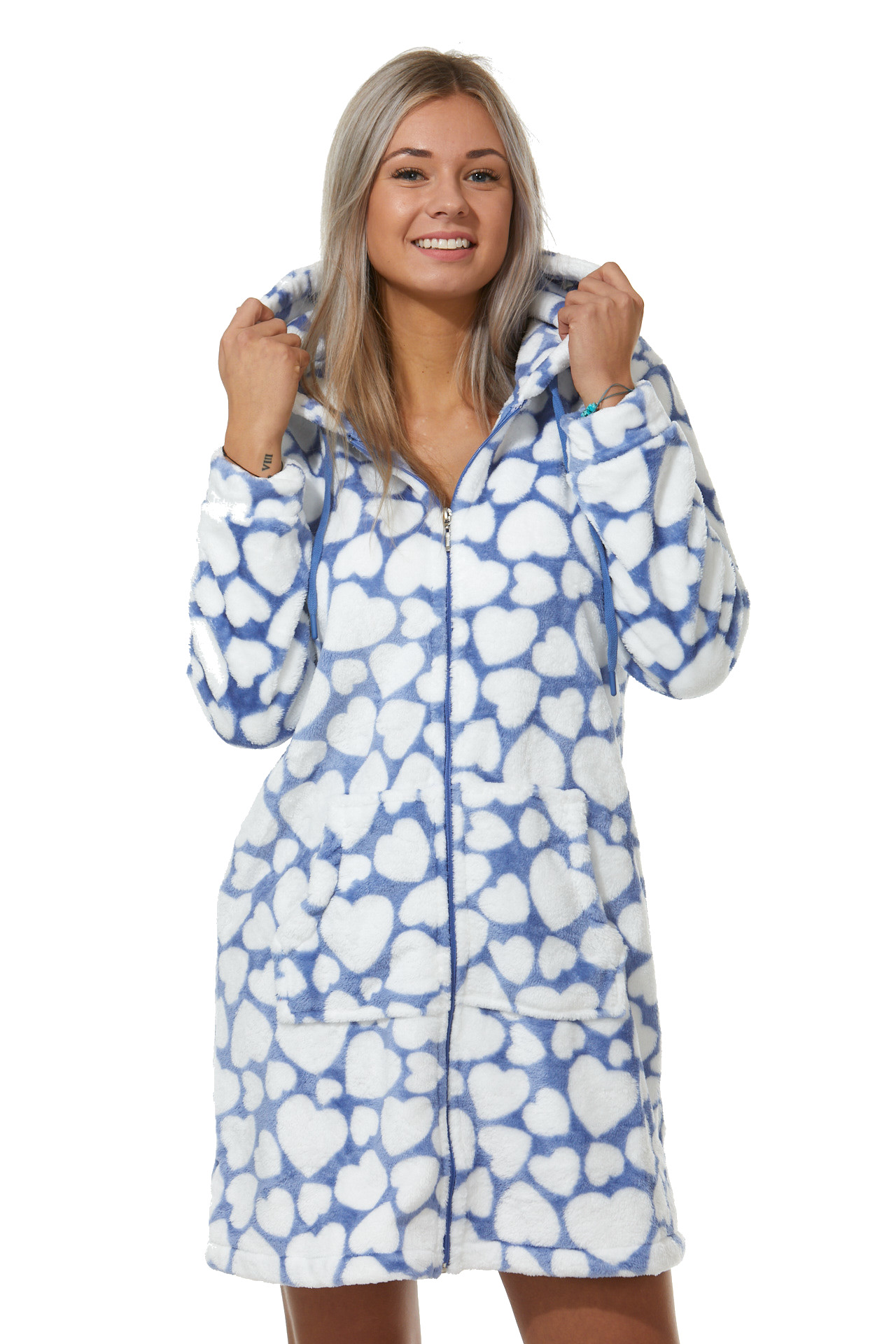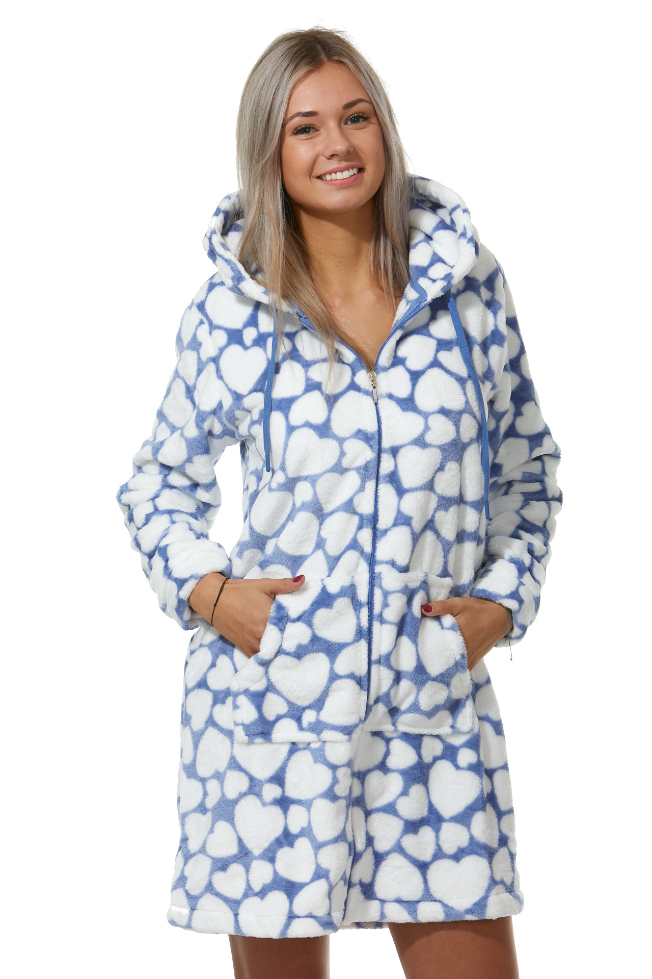 Modrý i bílý srdíčkový dámský huňatý župan na zip