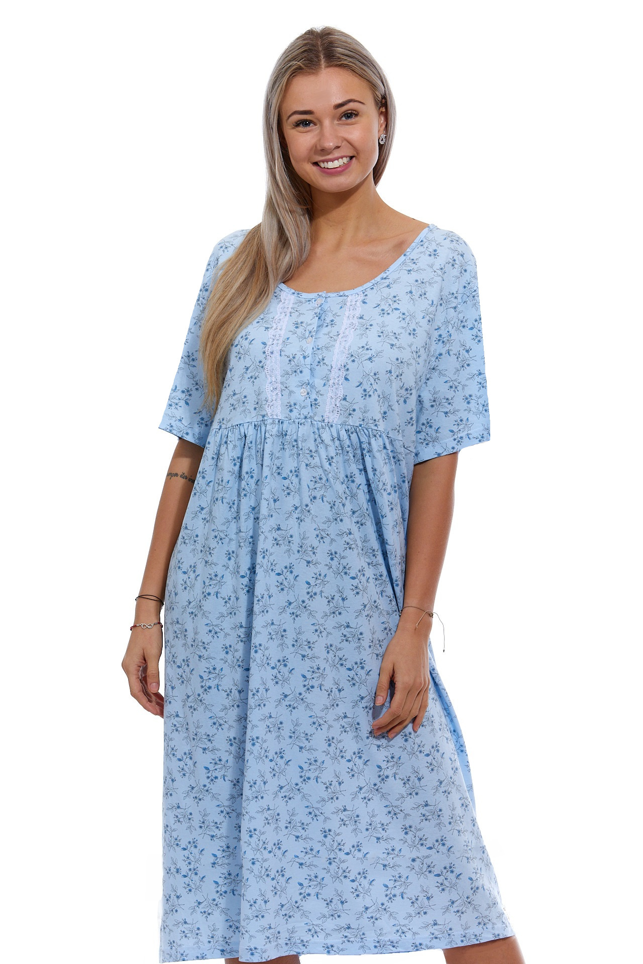 Dlouhá modrá květovaná noční košilka pro ženu na knoflíky s krajkou 1C3479