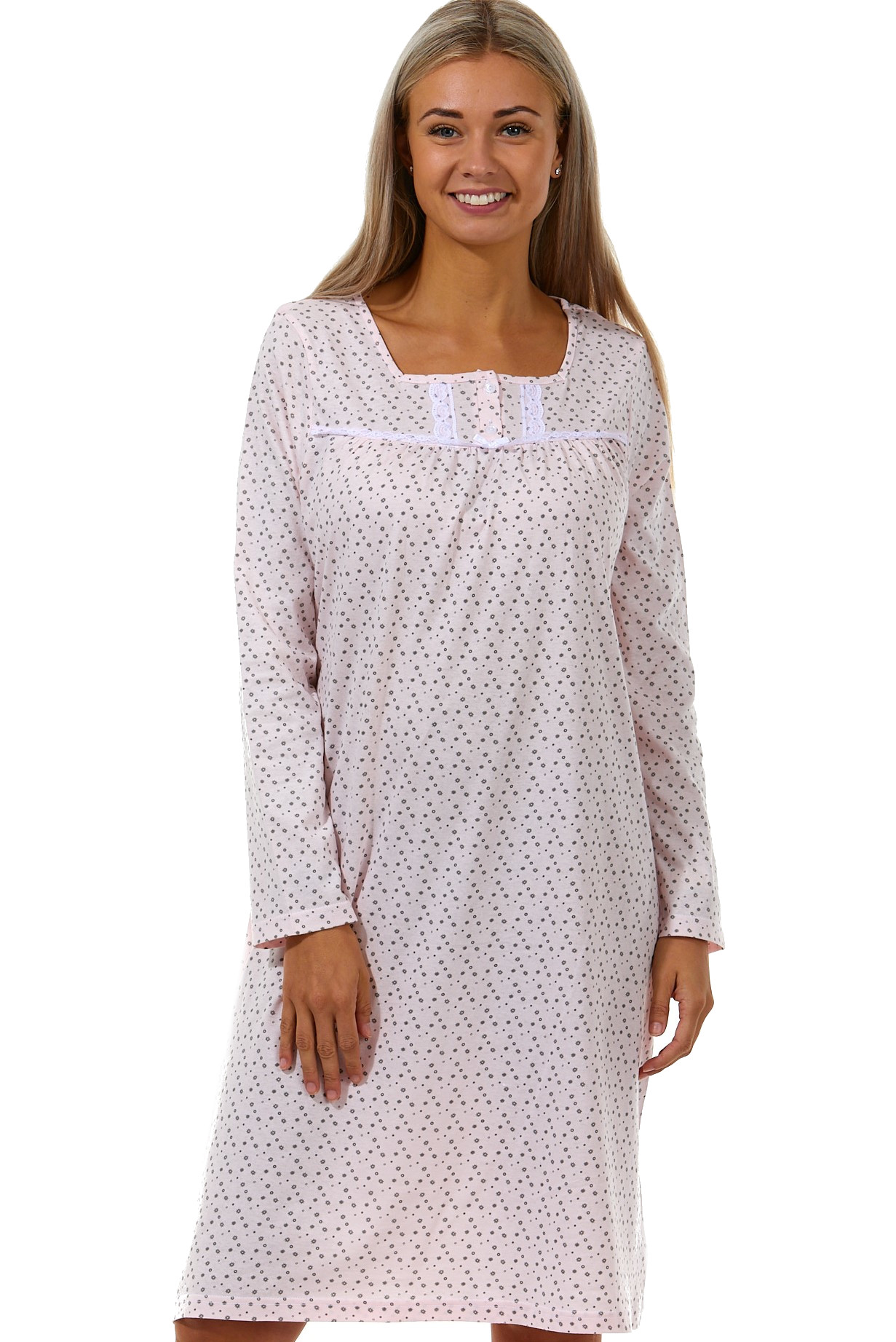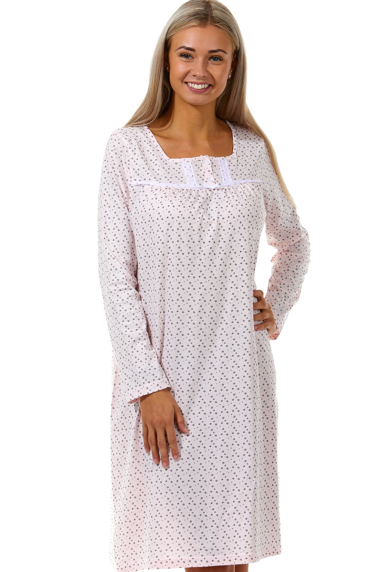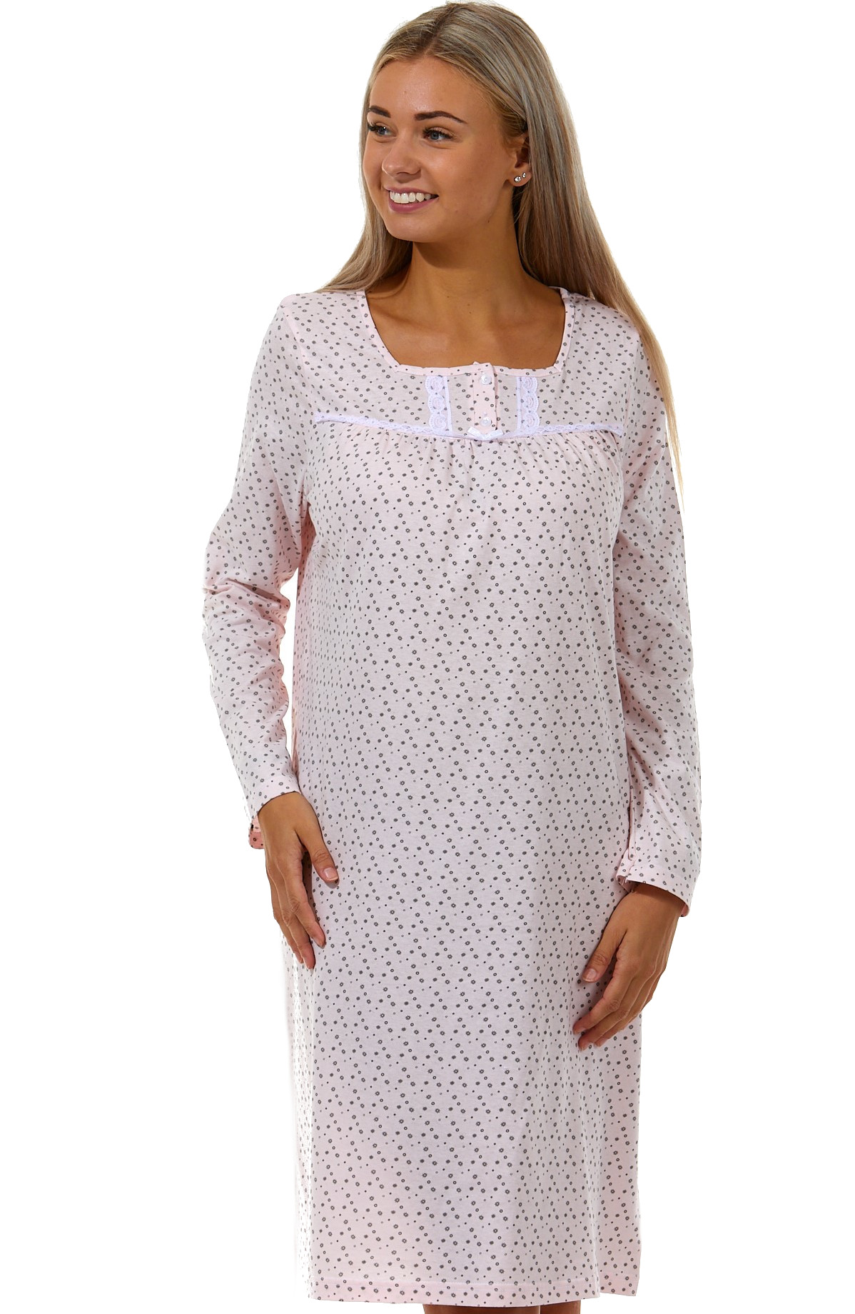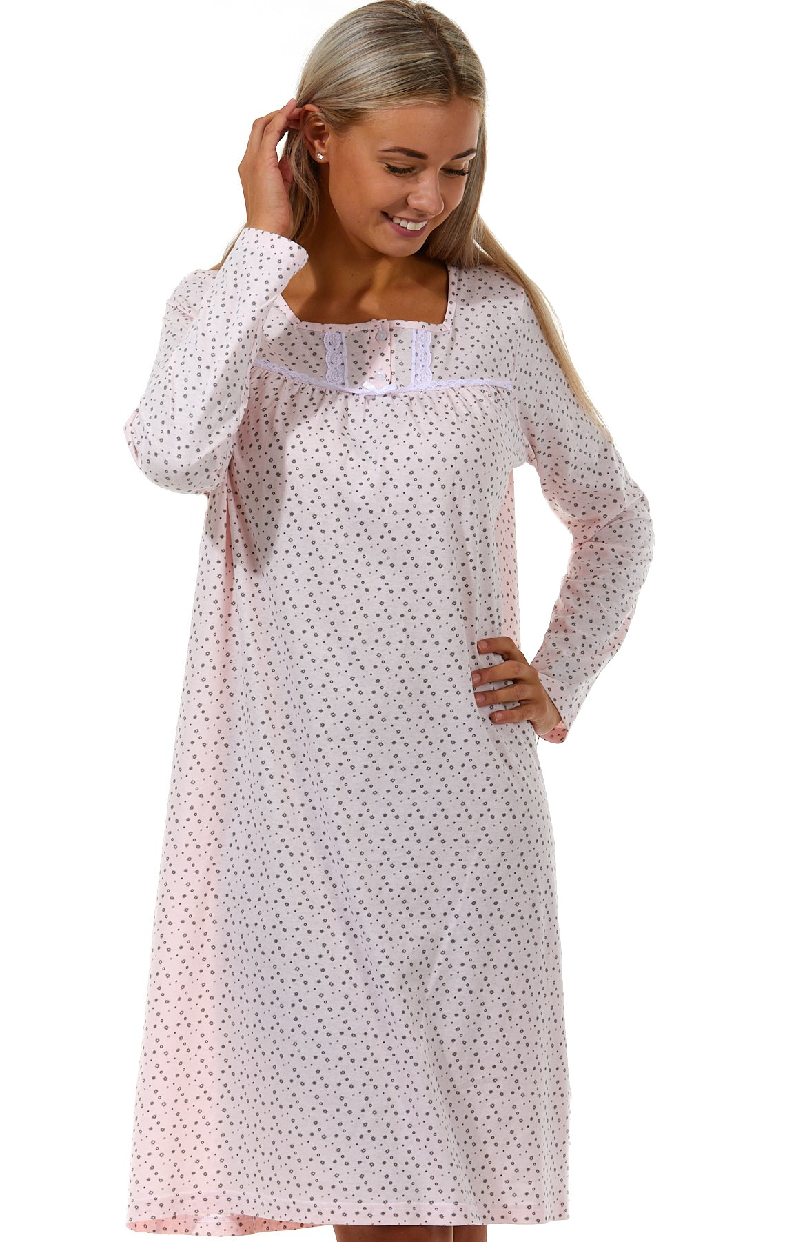 Dlouhá růžová puntíkatá noční košile pro ženy s dlouhým rukávem a krajkou