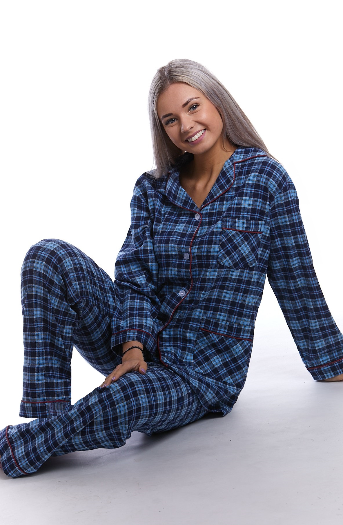 Elegantní teplé flanelové pyžamo dámské na kojení - modré karované