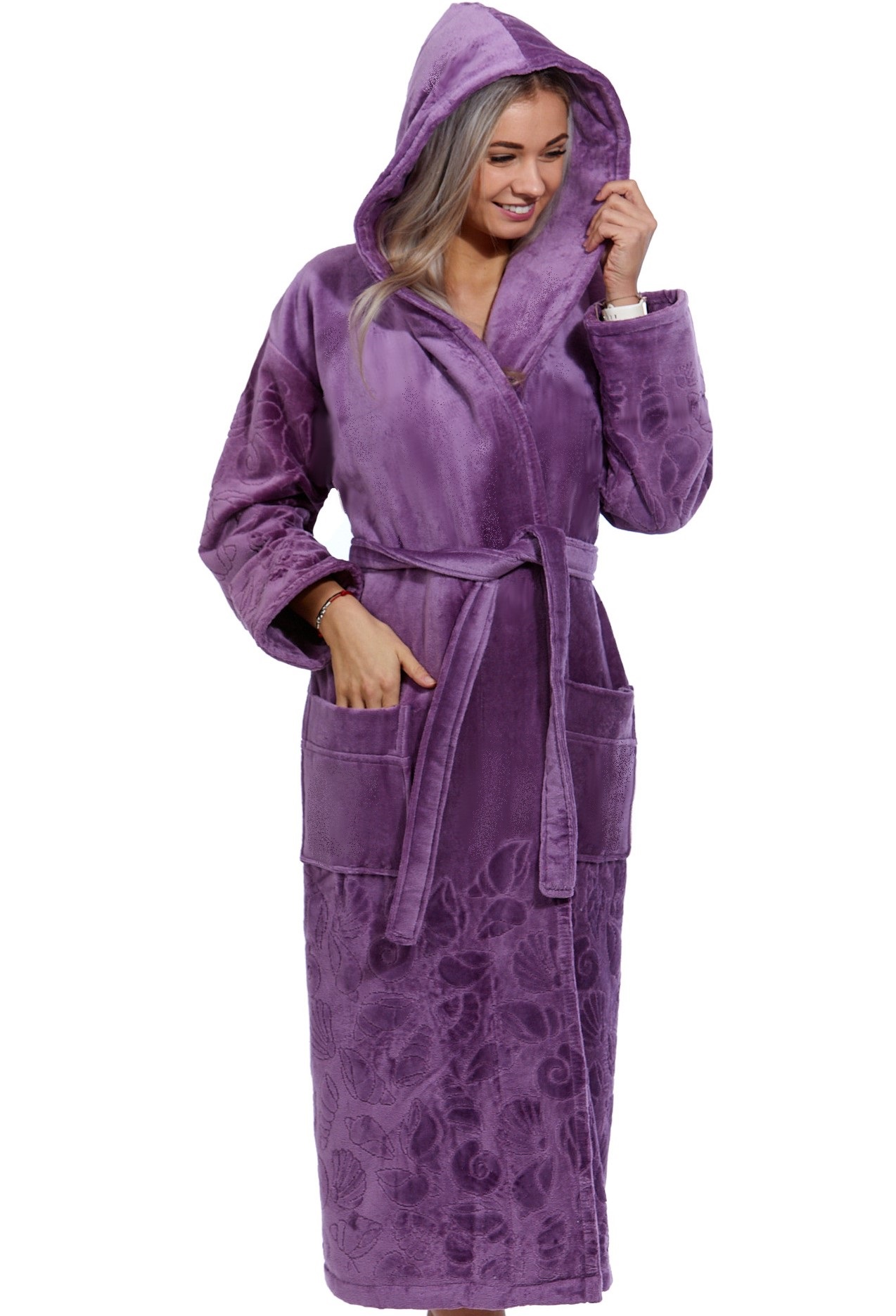 Fialový luxusní dlouhý župan pro ženu z extra froté MOŘSKÝ SVĚT A MUŠLIČKY