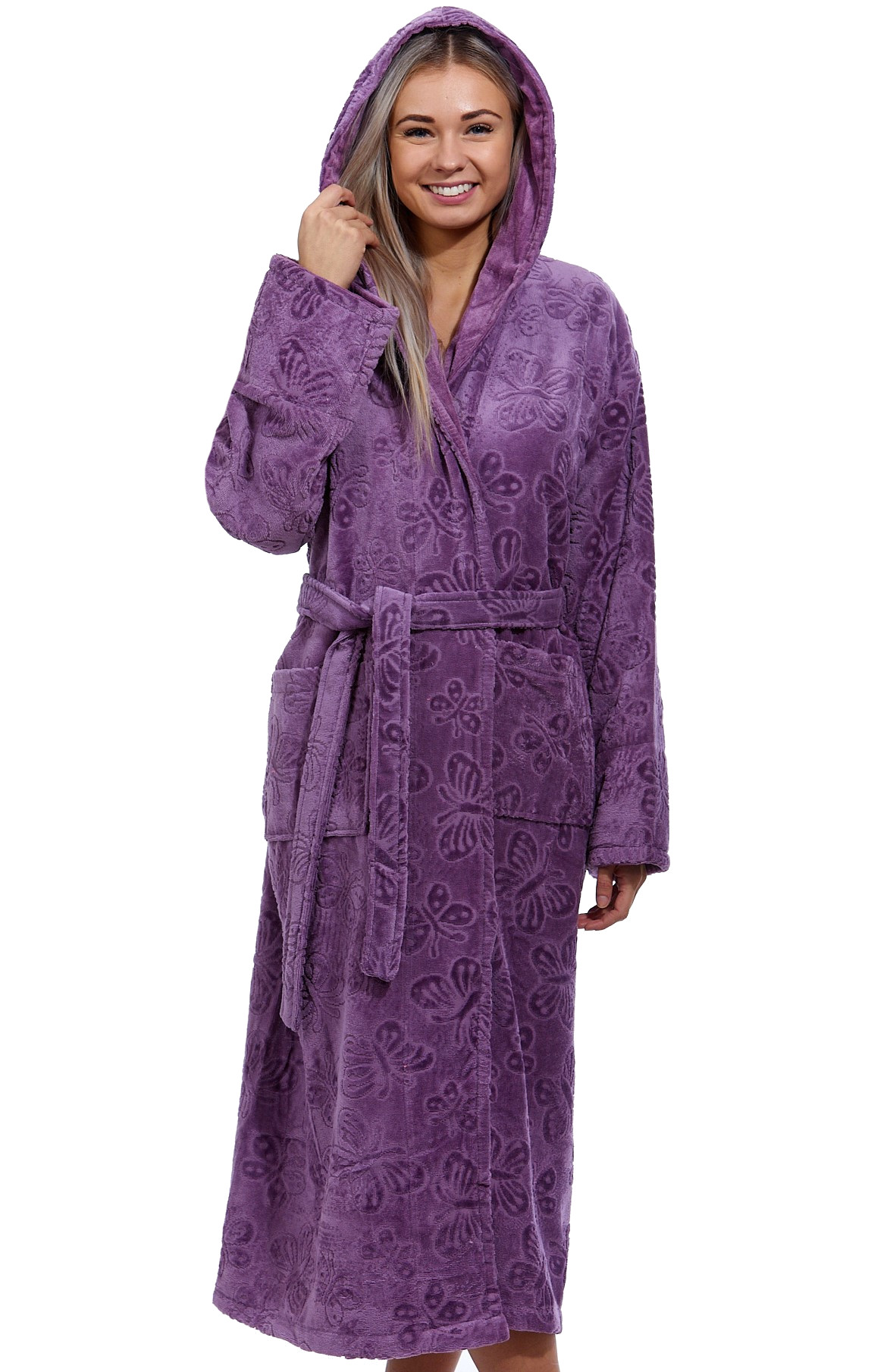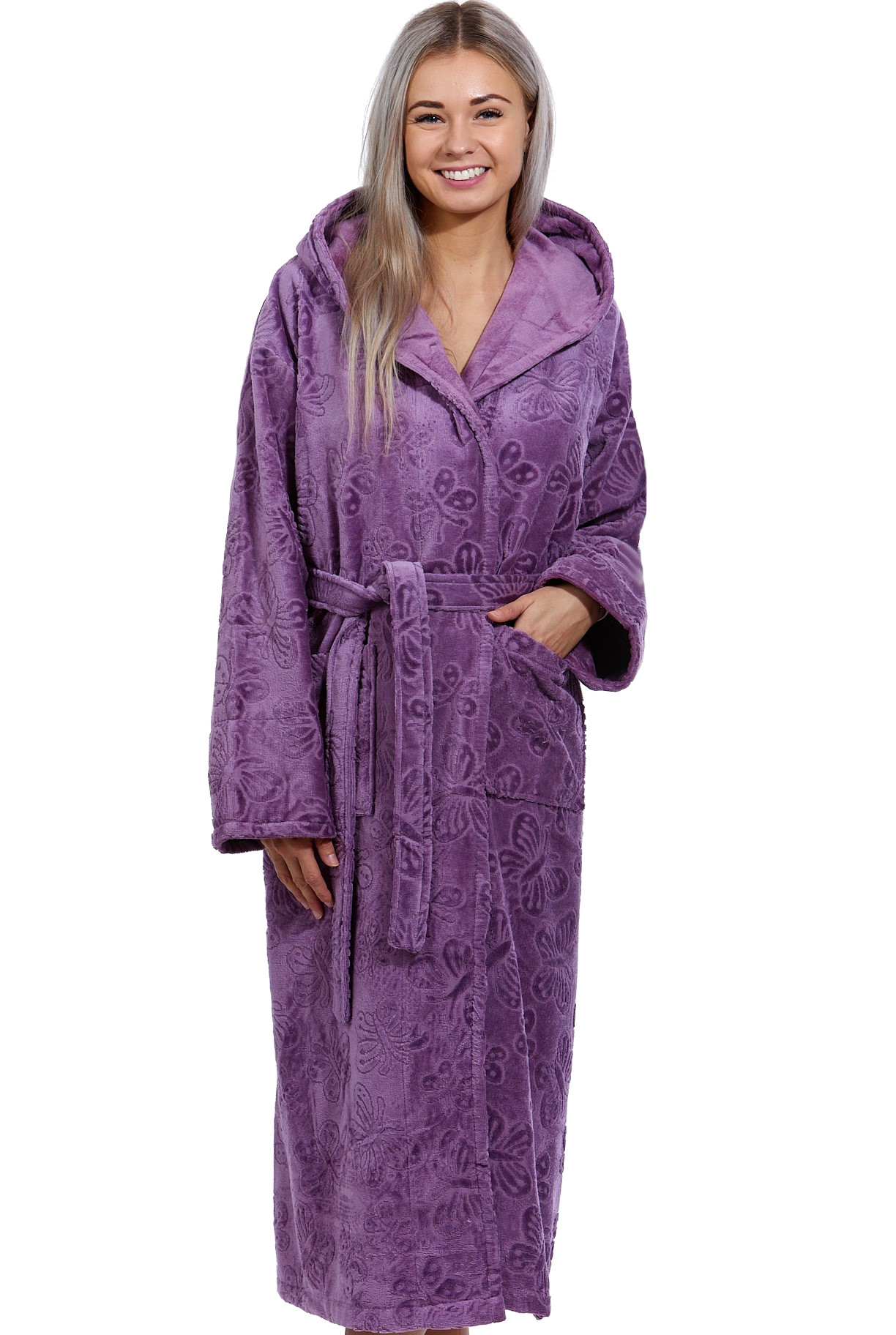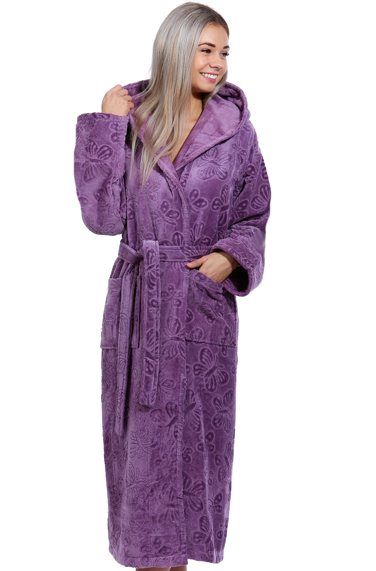 Fialový luxusní dlouhý župan pro ženu z extra froté MOTÝLÍ VZOR