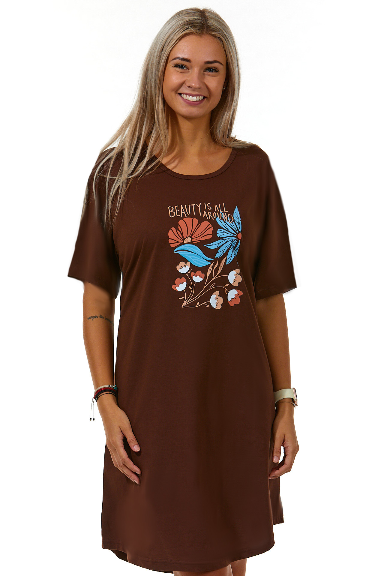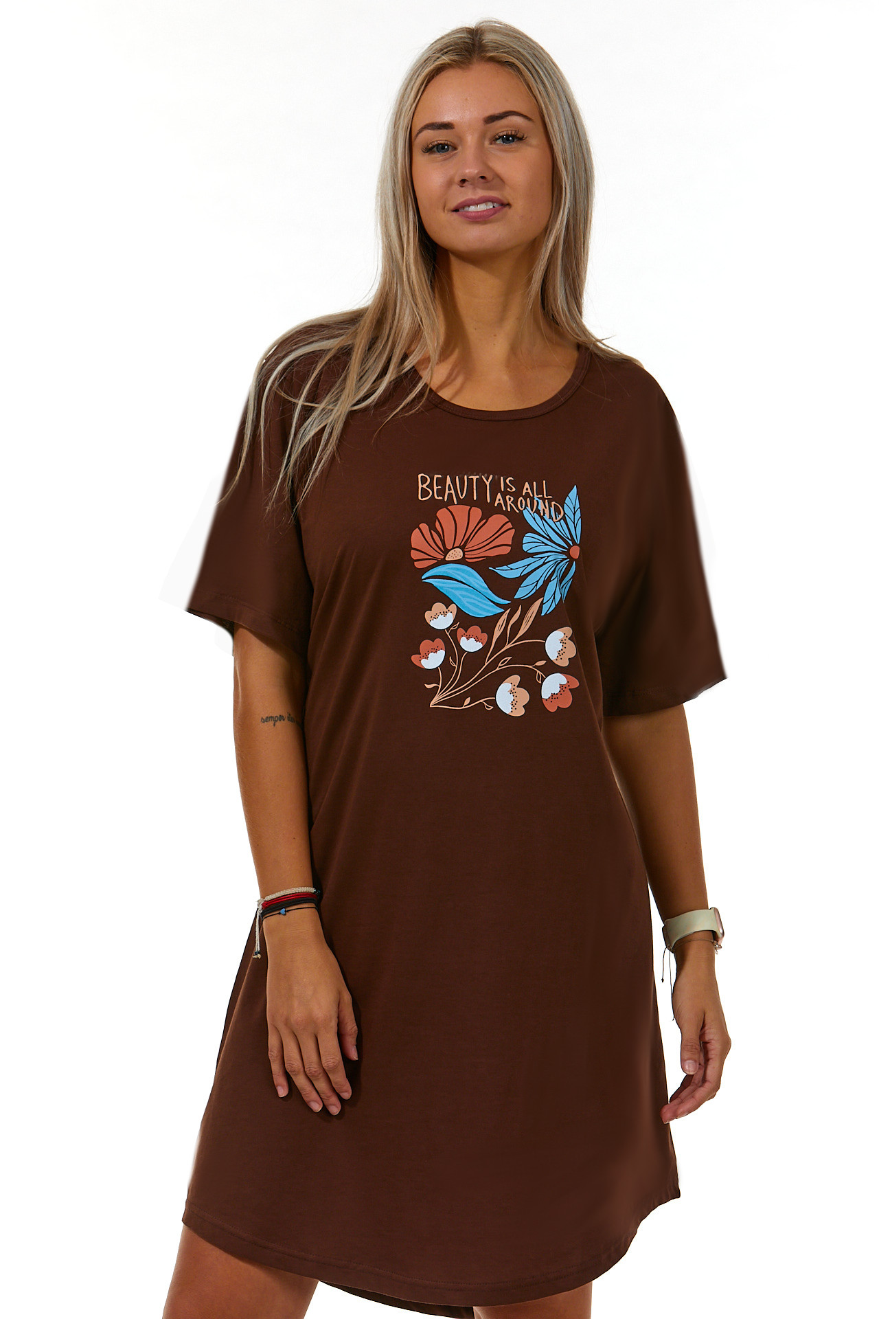 Hnědá noční košilka pro plnoštíhlé ženy s obrázkem květin