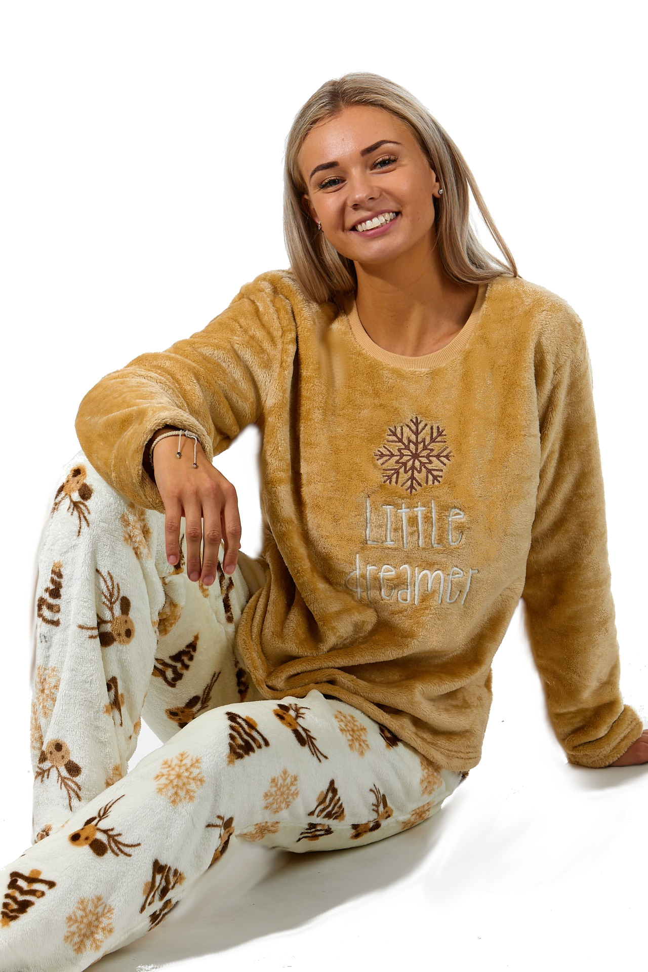 Hnědé i béžové extra teplé pyžamo dámské s jeleny i sněhové vločky a Vánoce - Malý snílek