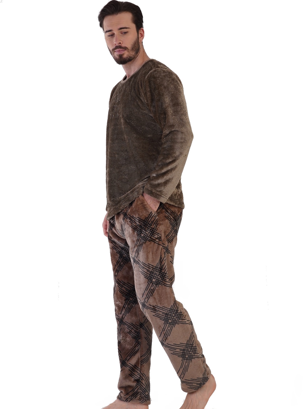 Hnědé kárované huňaté extra TEPLÉ pánské pyžamo DO EPIC THINGS 1Z1591