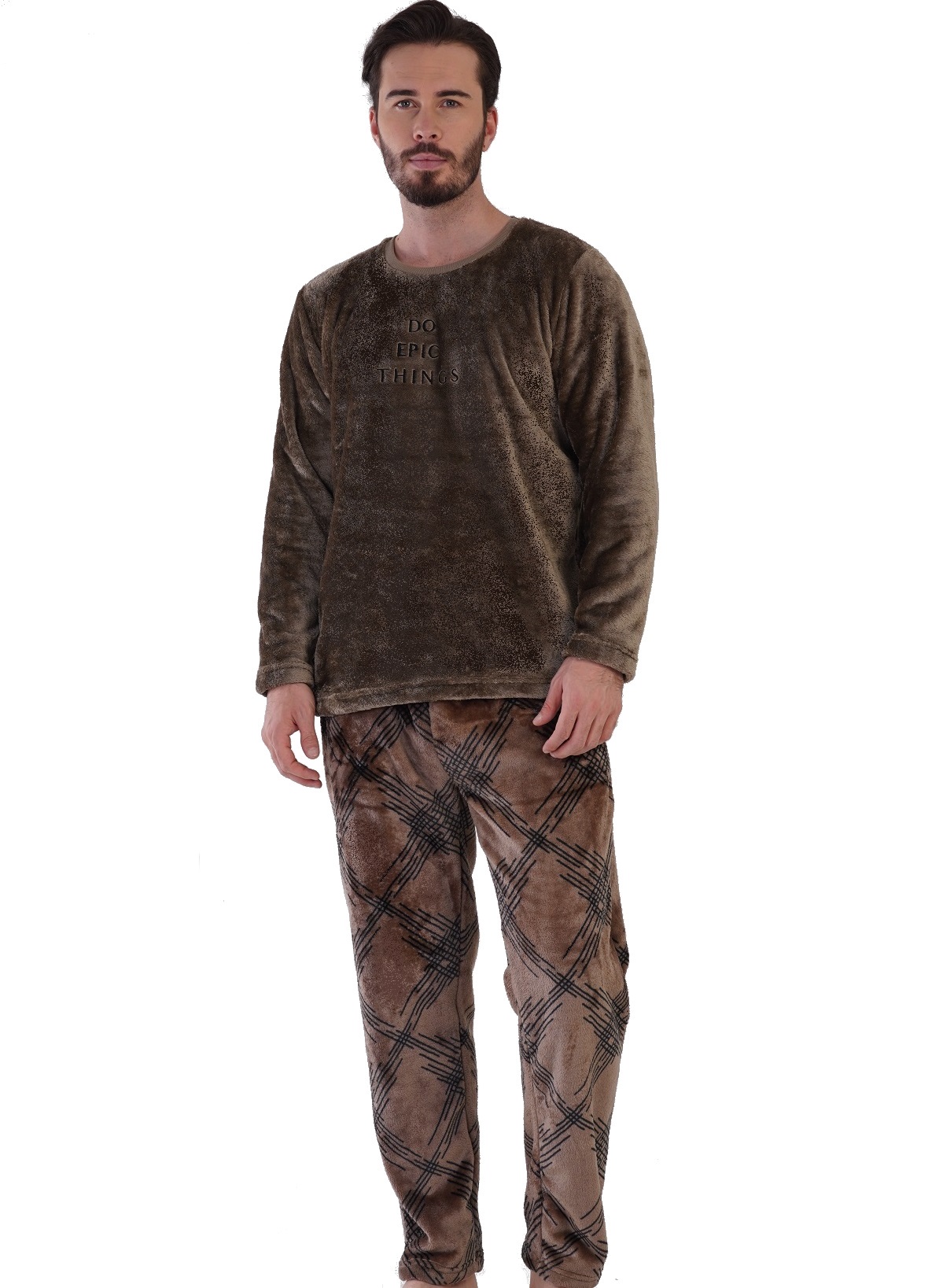 Hnědé kárované huňaté extra teplé pánské pyžamo DO EPIC THINGS