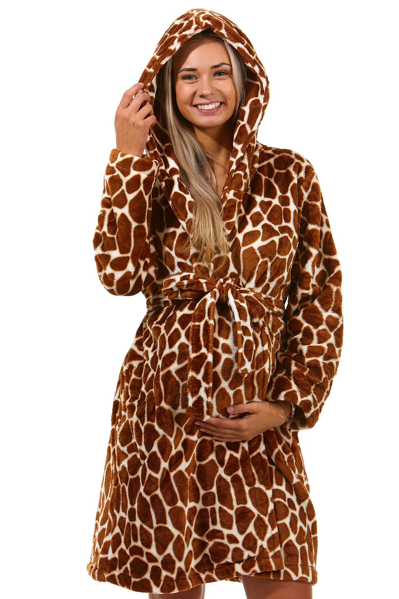 Hnědý huňatý župan s kapucí pro plnoštíhlé ženy na kojení, žirafí vzor, big
