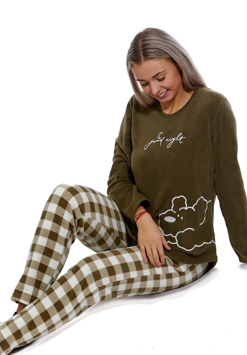 Khaki zelené i kostkované luxusní hřejivé dámské pyžamo S PEJSKEM