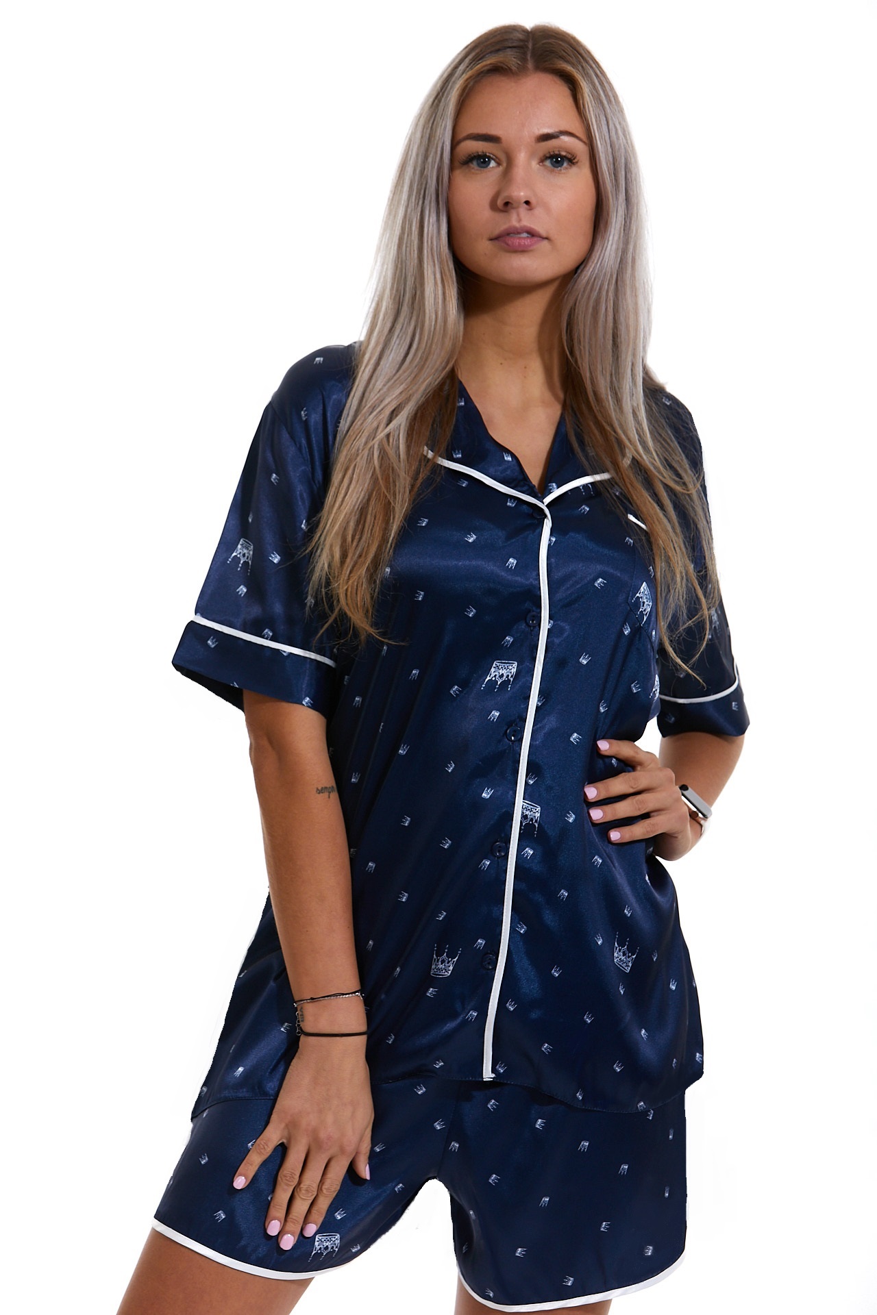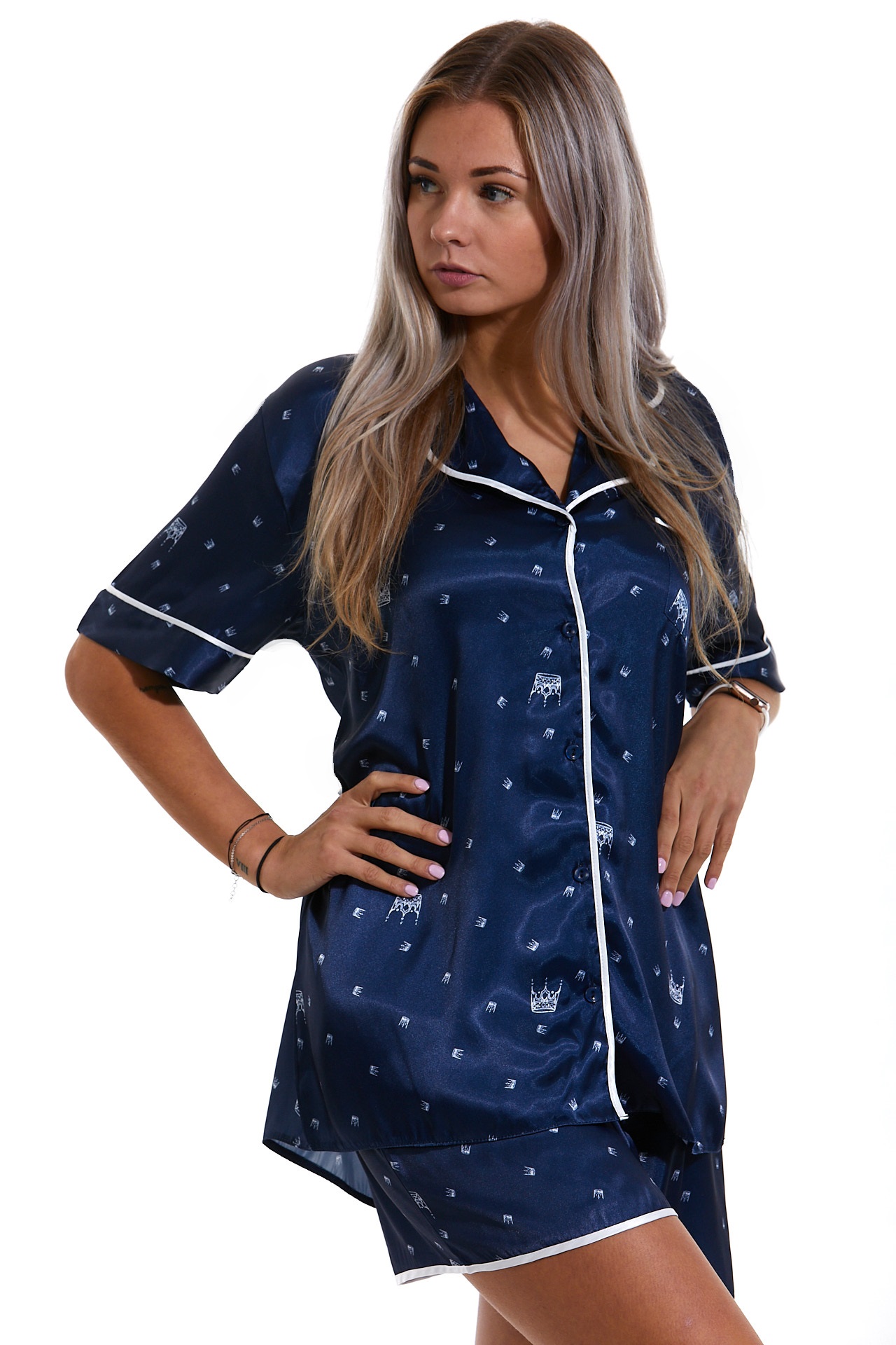 Modré klasické luxusní pyžamo dámské ze saténu Queen