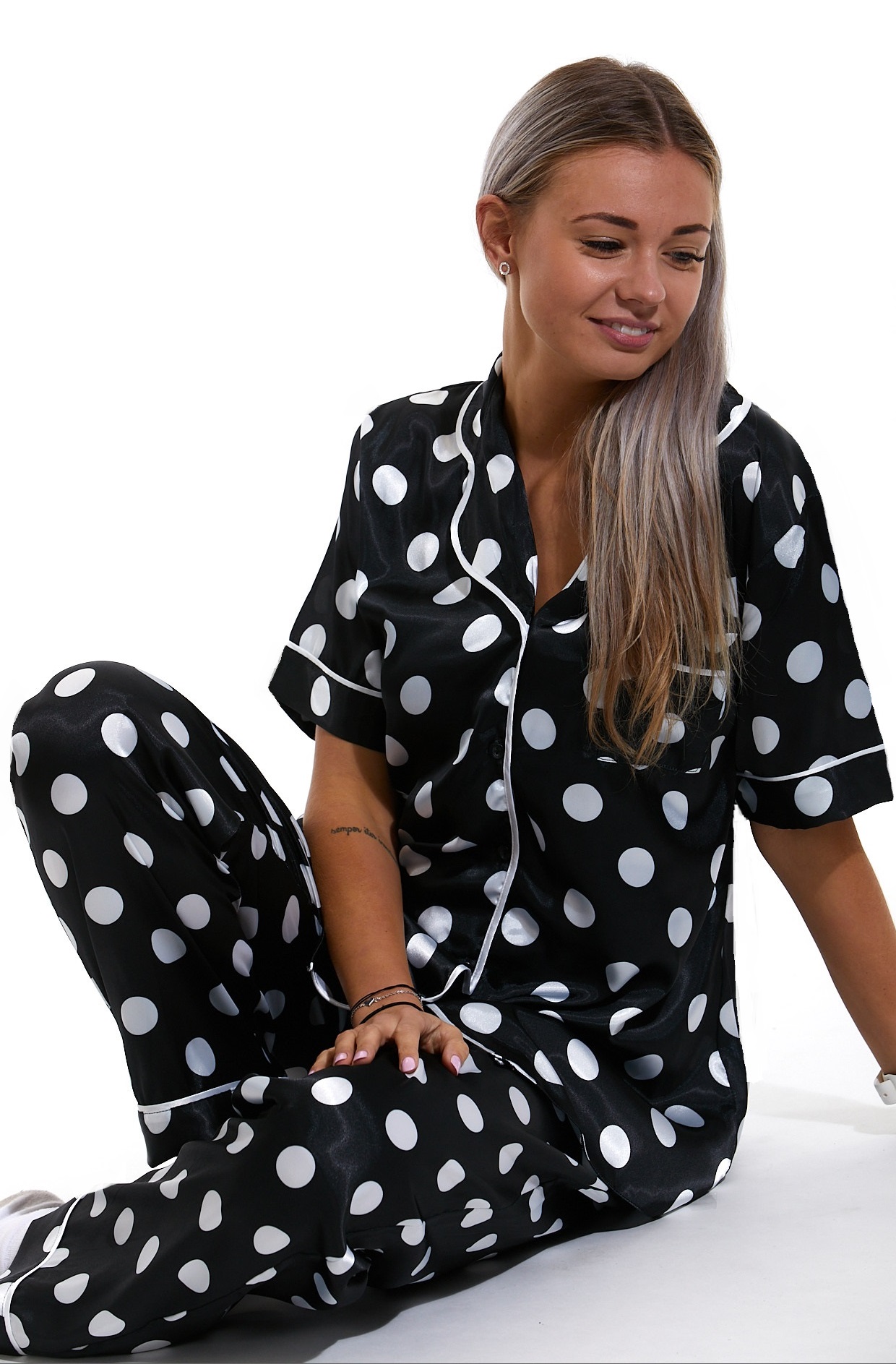 Černo bílé puntíkaté klasické luxusní pyžamo dámské ze saténu 1E8468