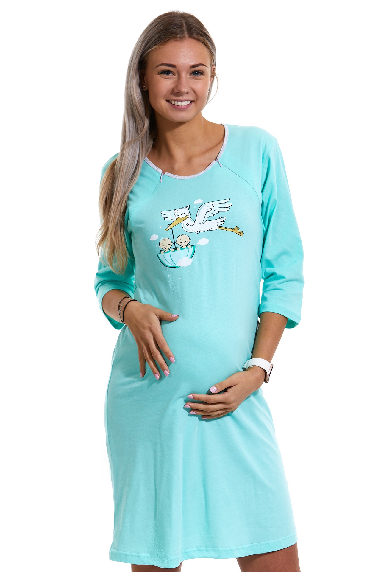 Nebesky modrá kojící a těhotenská košilka, čáp nese miminka
