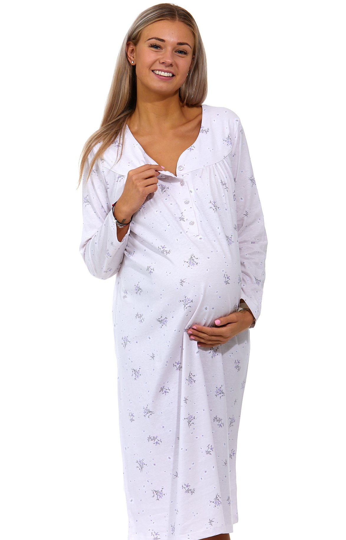 Světle fialová kojící a těhotenská košile dlouhá s dlouhým rukávem na knoflíky s květy
