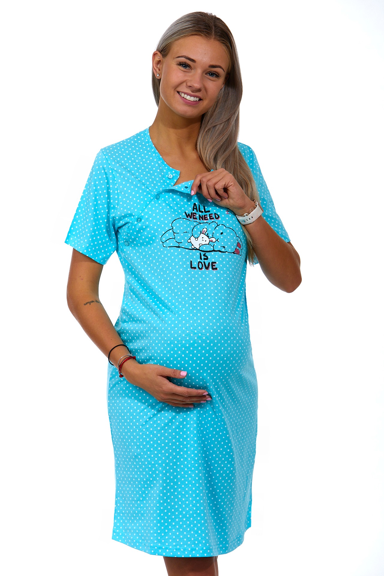 Azurová puntíkatá kojící a těhotenská košilka na knoflíky - all we need is love