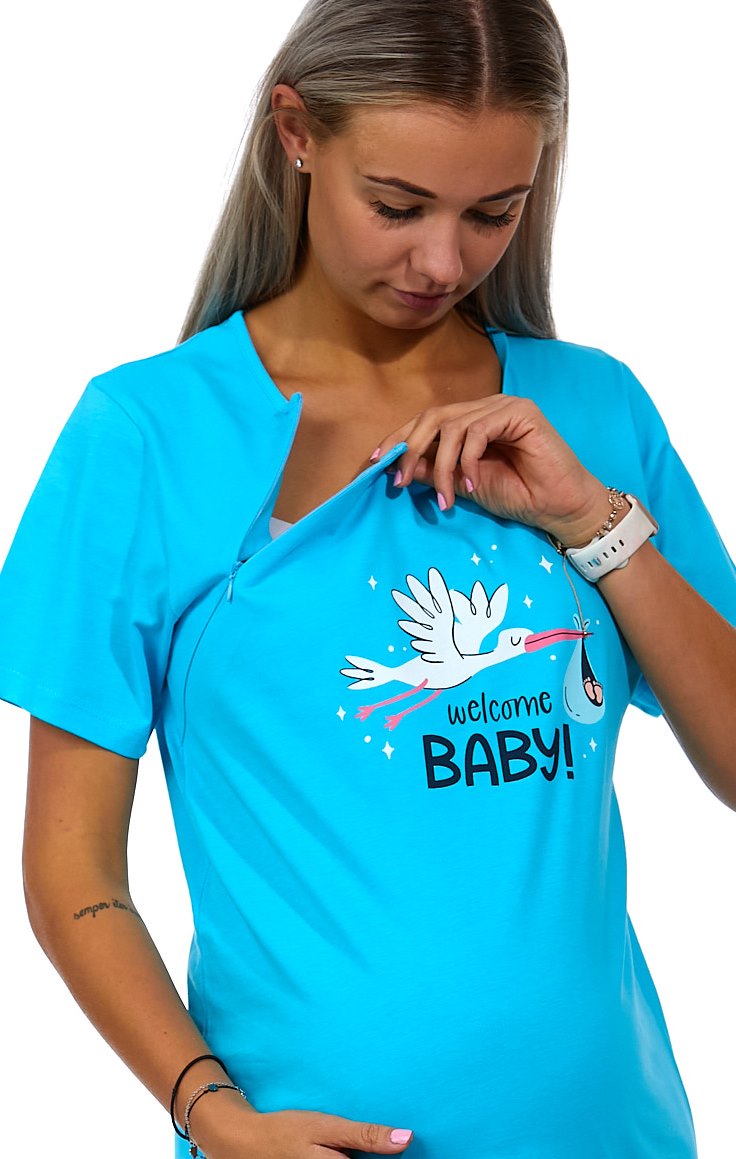 Tmavě azurová kojící a těhotenská košilka na zipy, Čáp nese miminko, WELCOME BABY!