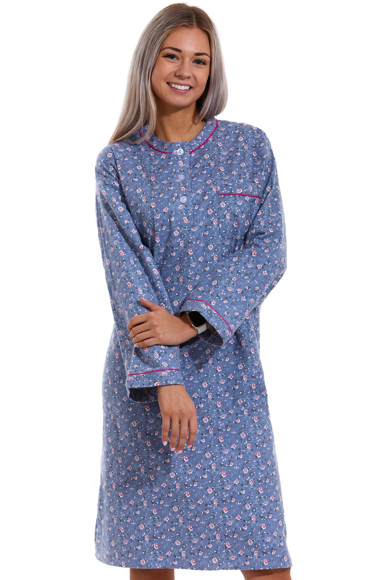 Holubí modř s růžičky, flanelová extra teplá noční košilka dámská - dlouhá