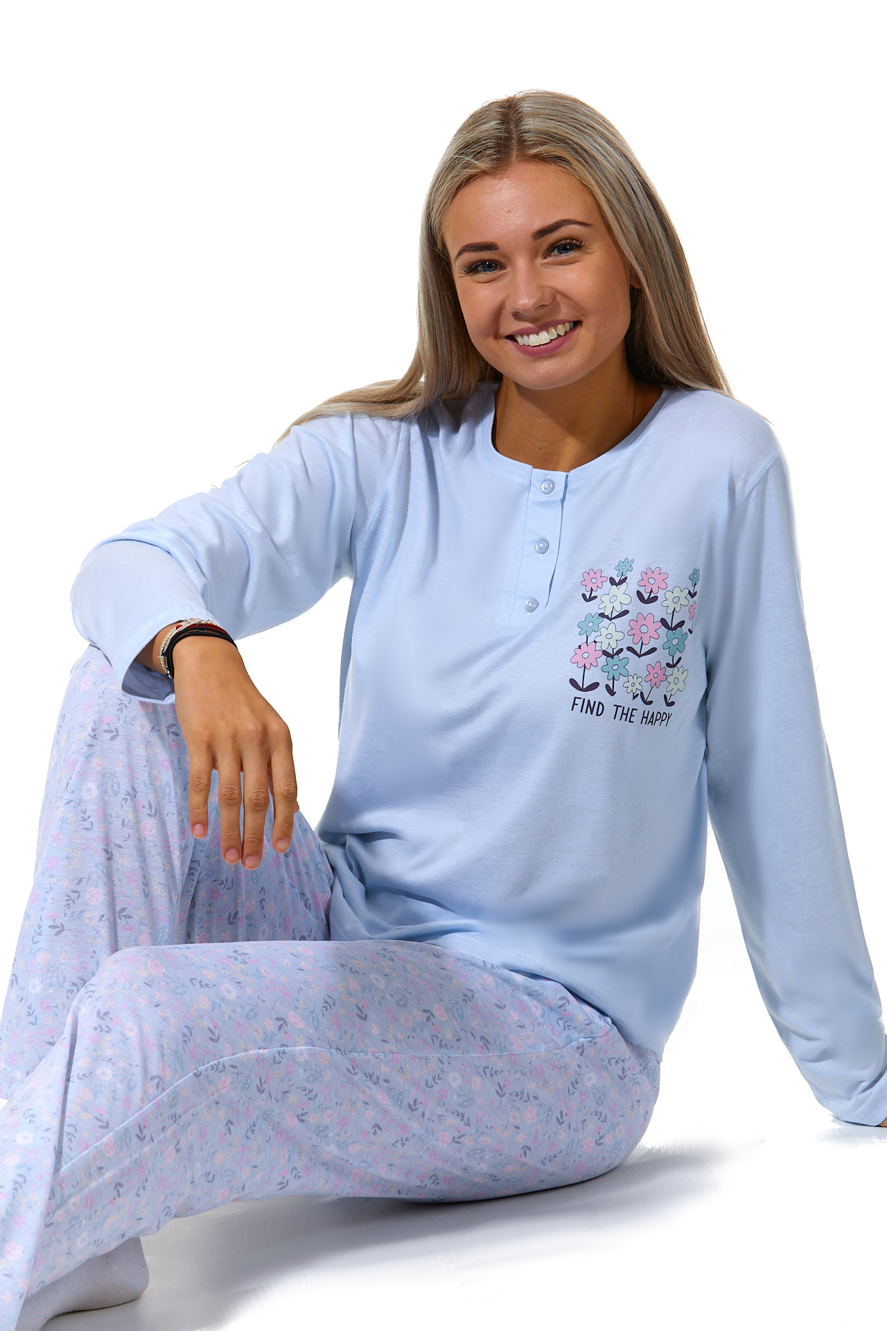 Květinové nebesky modré dámské pyžamo s knoflíky - najdi štěstí