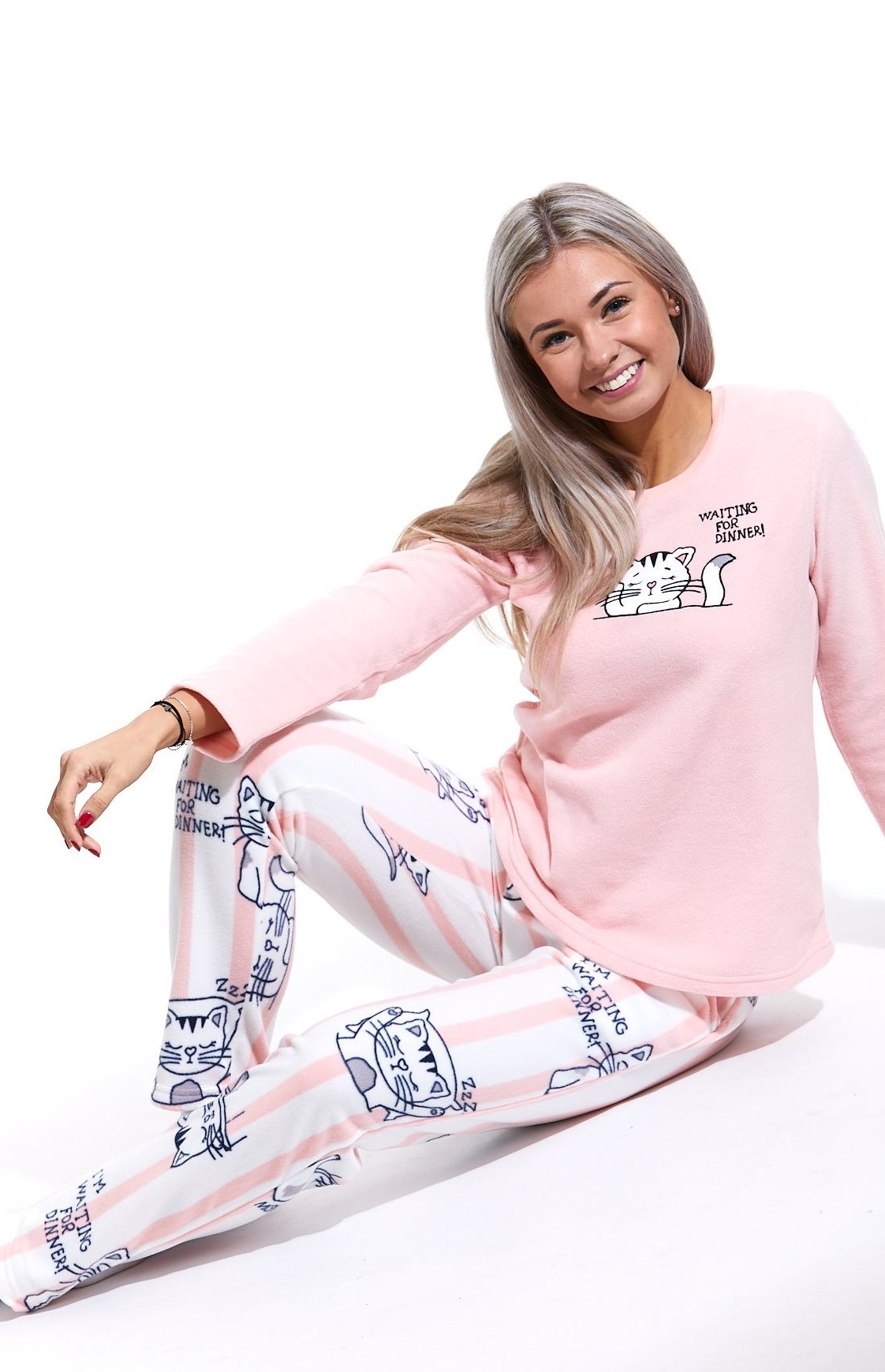 Růžové a pruhované dámské pyžamo, spící kočička