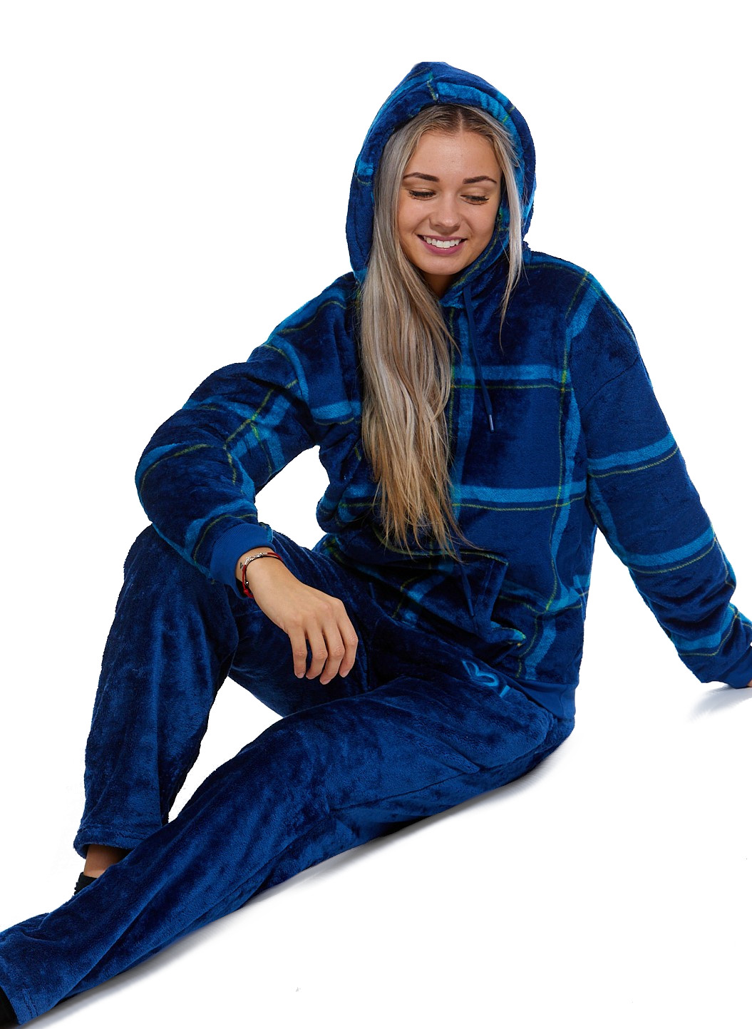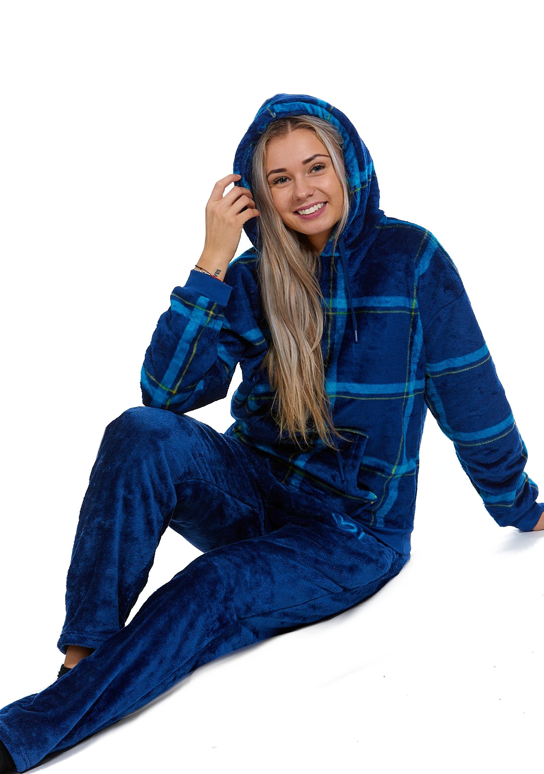 Modré a tyrkysově kárované extra teplé huňaté pyžamo s kapucí pro ženy i dívky 1Z1602