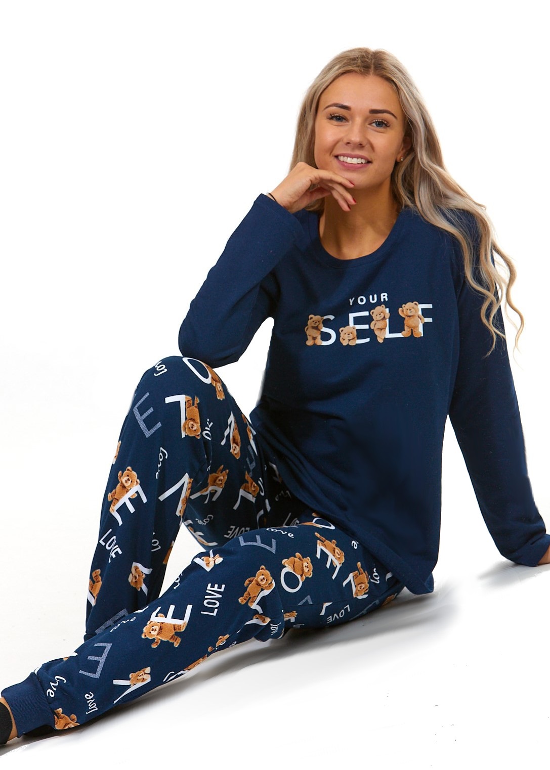 Modré i hnědé bavlněné extra teplá pyžamo pro ženy i dívky Plyšový medvídek LOVE