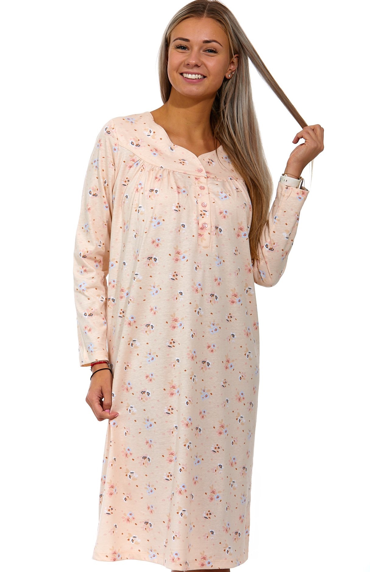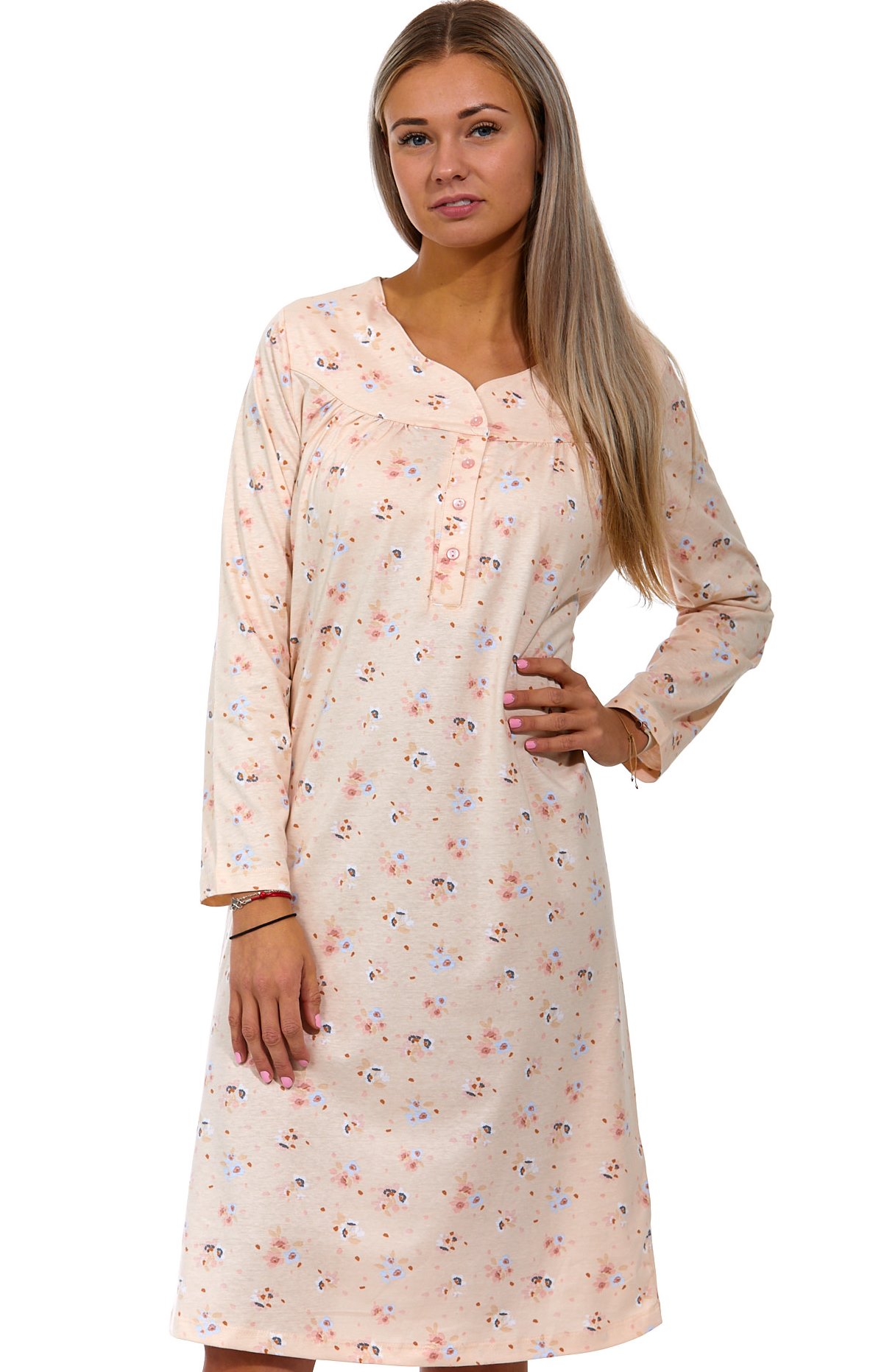 Meruňková a šedě květovaná noční košilka pro ženu dlouhá s dlouhým rukávem a knoflíky