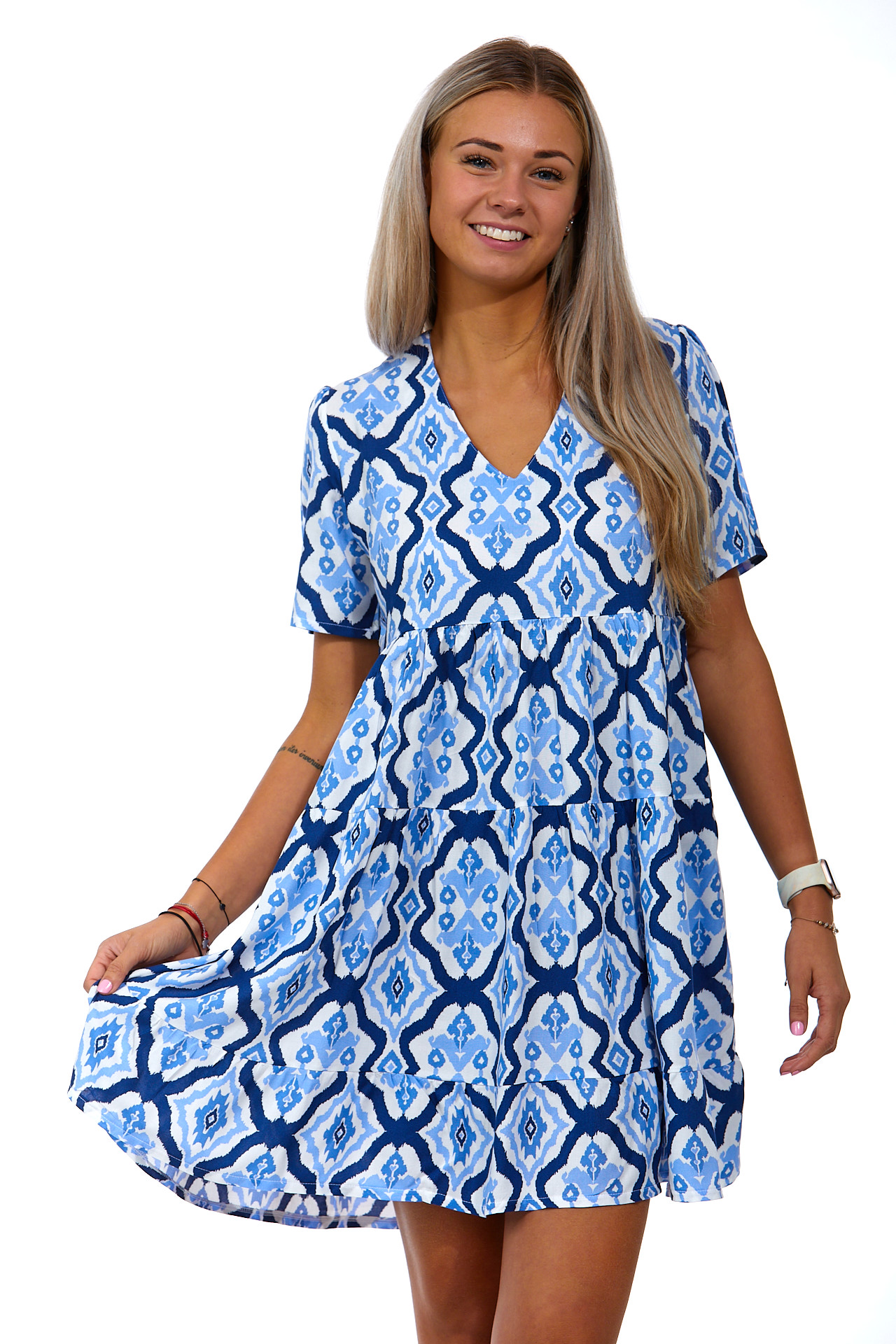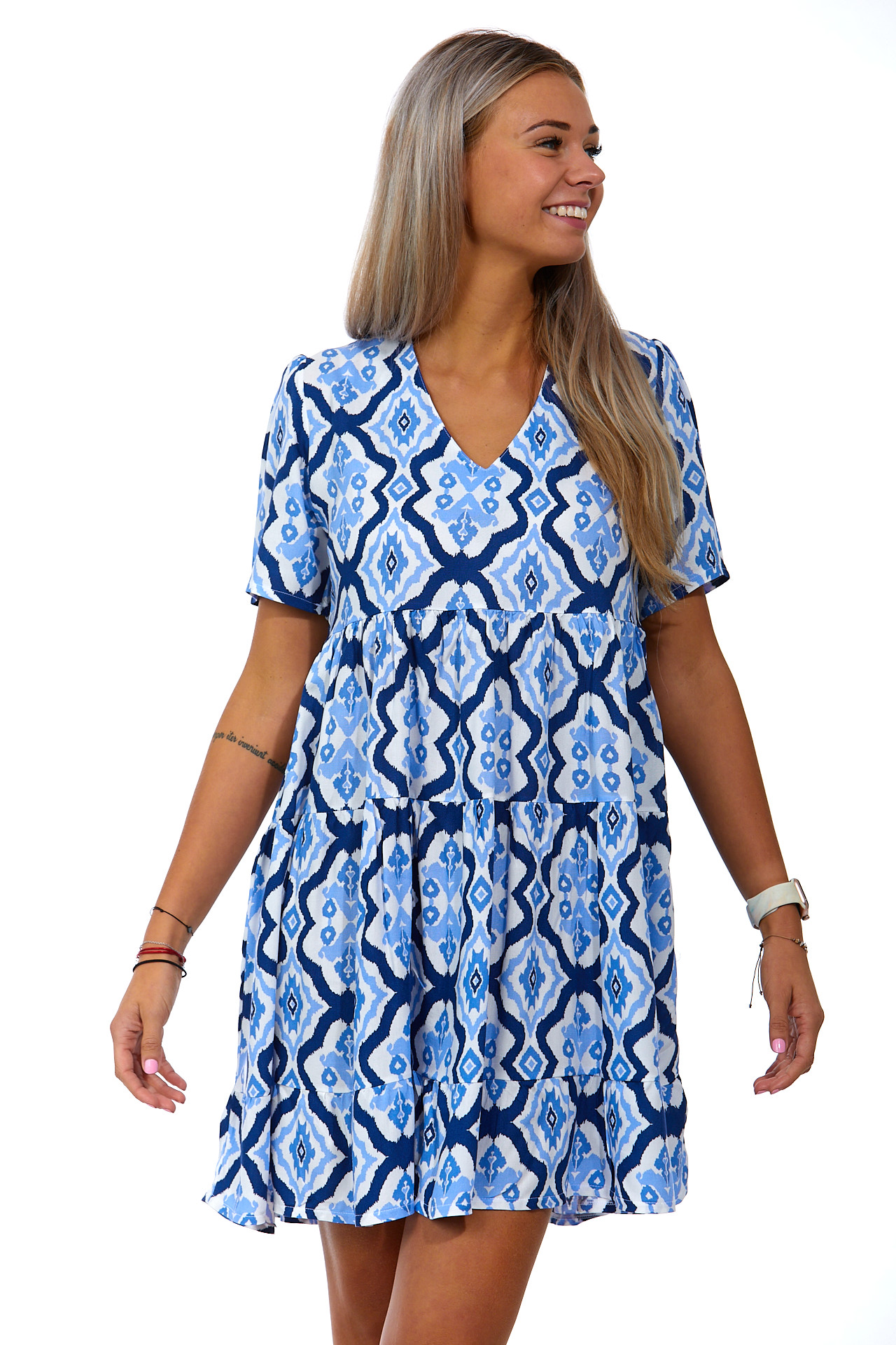 Modrá ležérní šatová tunika, noční košilka pro ženy s norským vzorem a volány