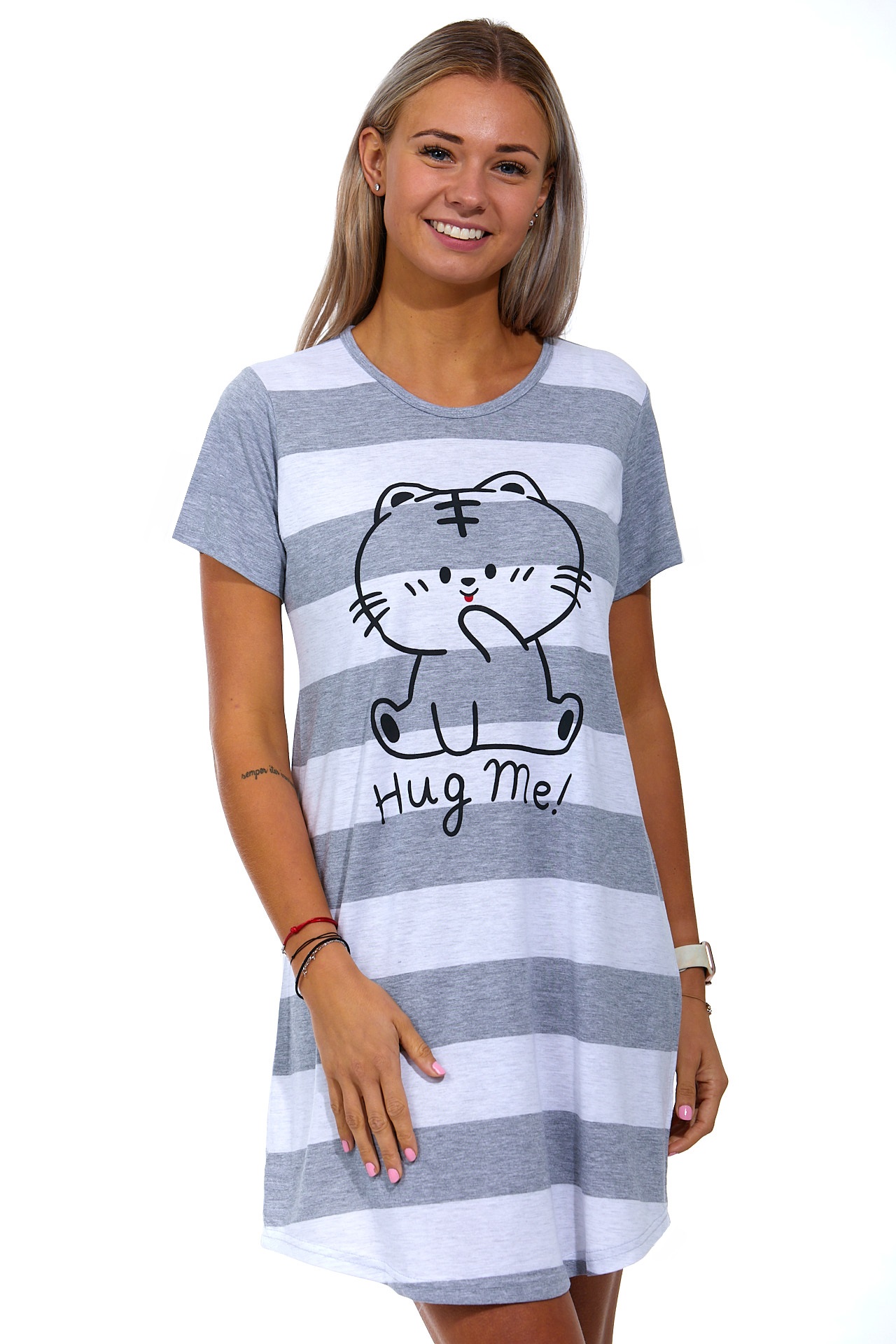 Šedě i bíle pruhovaná veselá noční košilka pro ženy s kočičkou, Hug Me