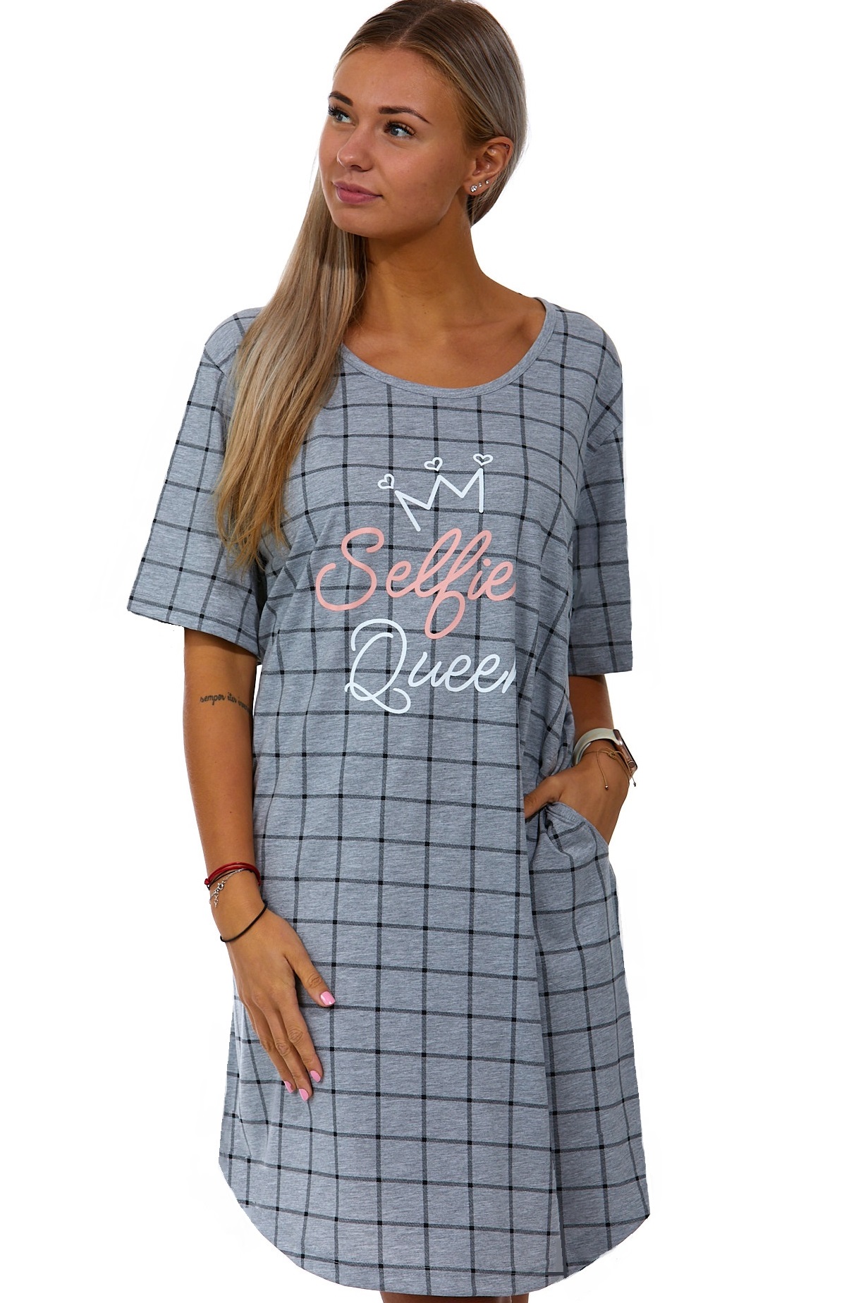 Šedá mřížkovaná noční košilka pro plnoštíhlé ženy Selfie Queen