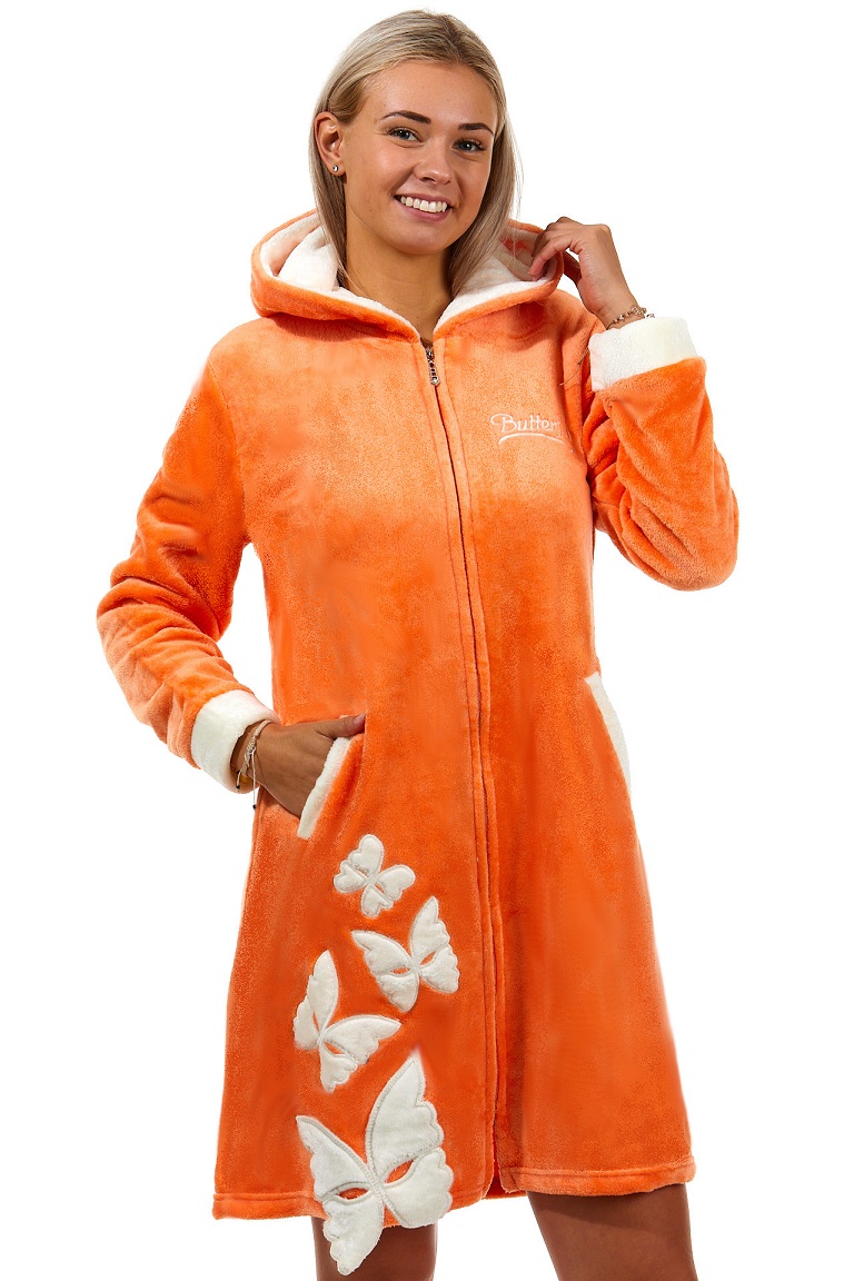Oranžový huňatý župan dámský na zip z bambusu - motýlci