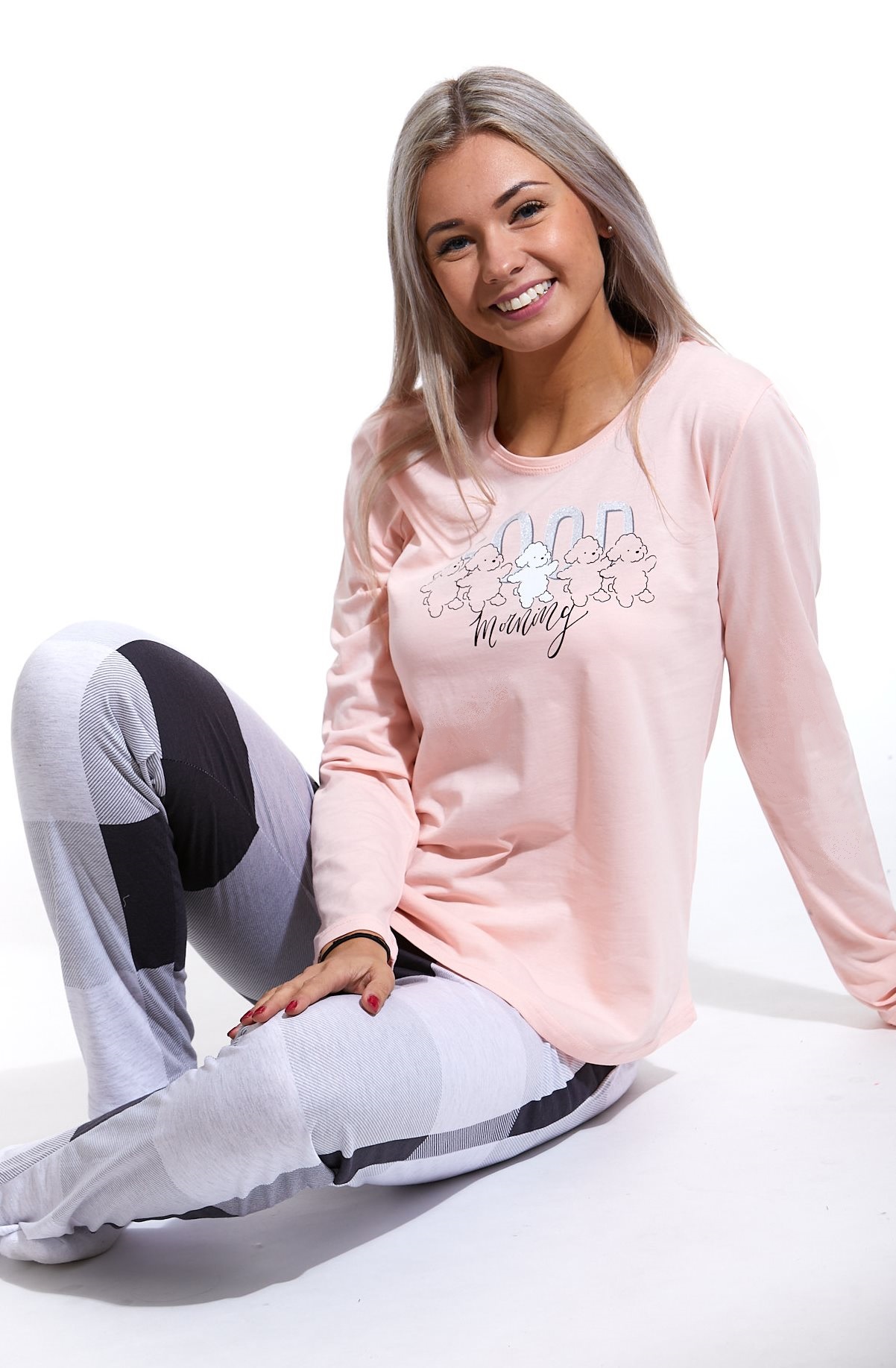 Růžovo šedé kárované pyžamo dámské, Good morning