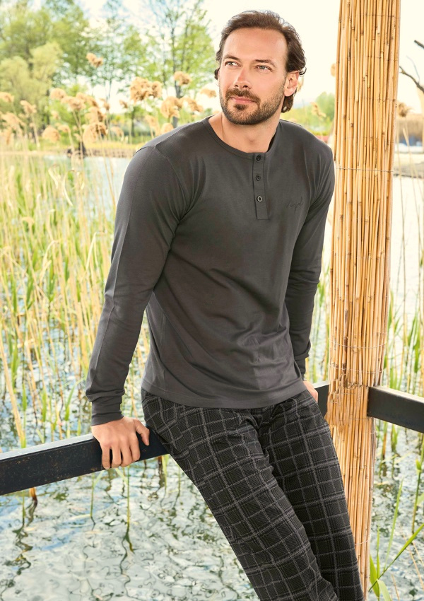 Tmavě šedé i černošedě kárované luxusní jemné pyžamo pro muže s knoflíčky