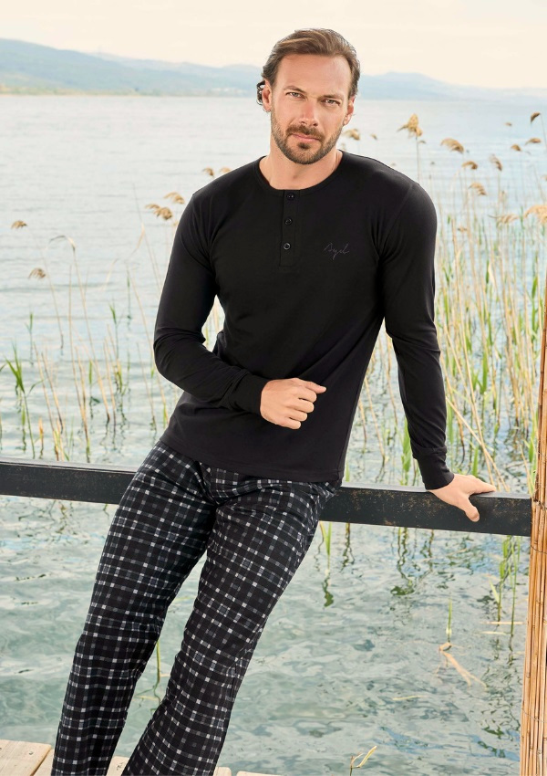 Černé i šedě kárované luxusní jemné pyžamo pro muže s knoflíčky