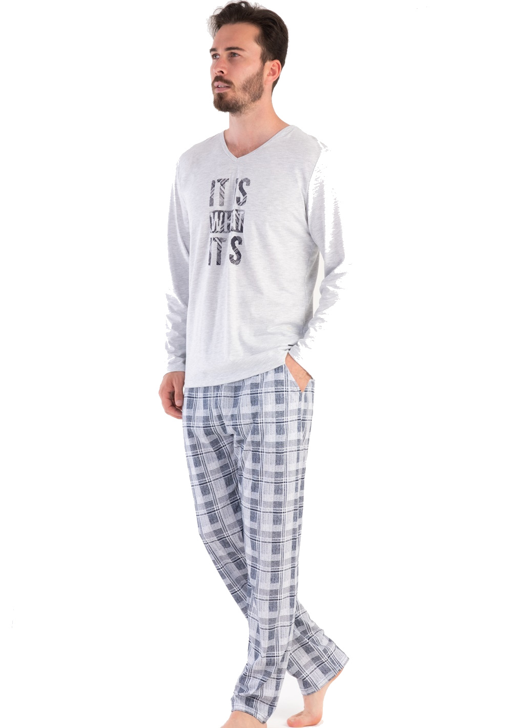 Šedé i modře žíhané pyžamo pro plnoštíhlé muže IT IS WHAT IT IS big