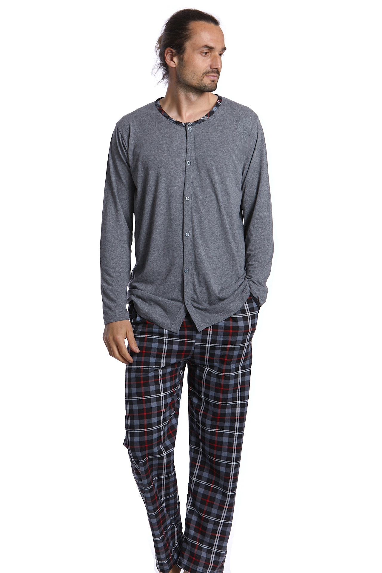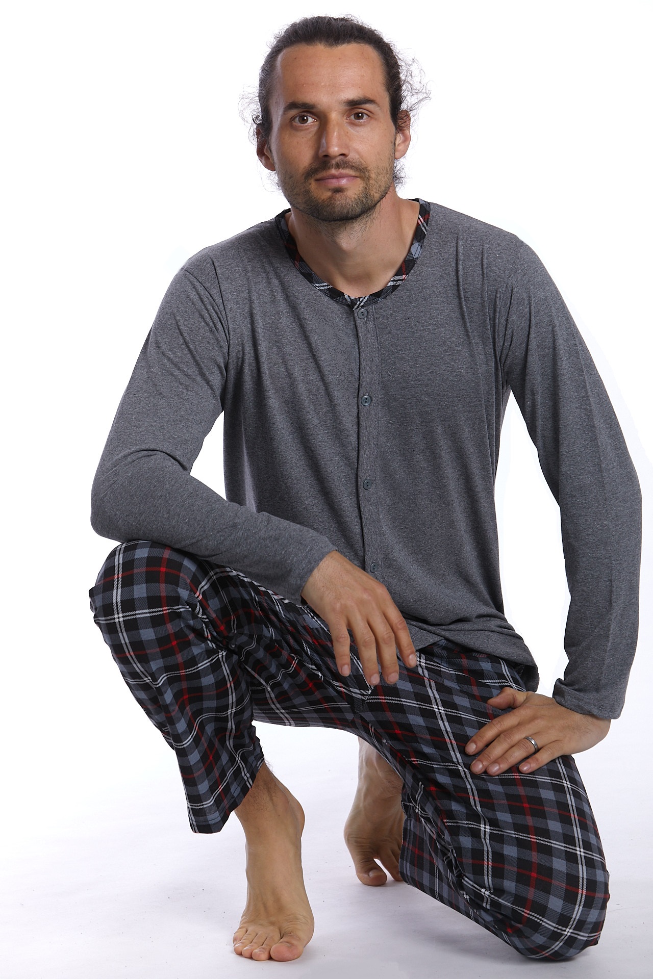 Kalhoty mají kapsy a celopropínací vršek na knoflíky s dlouhým rukávem