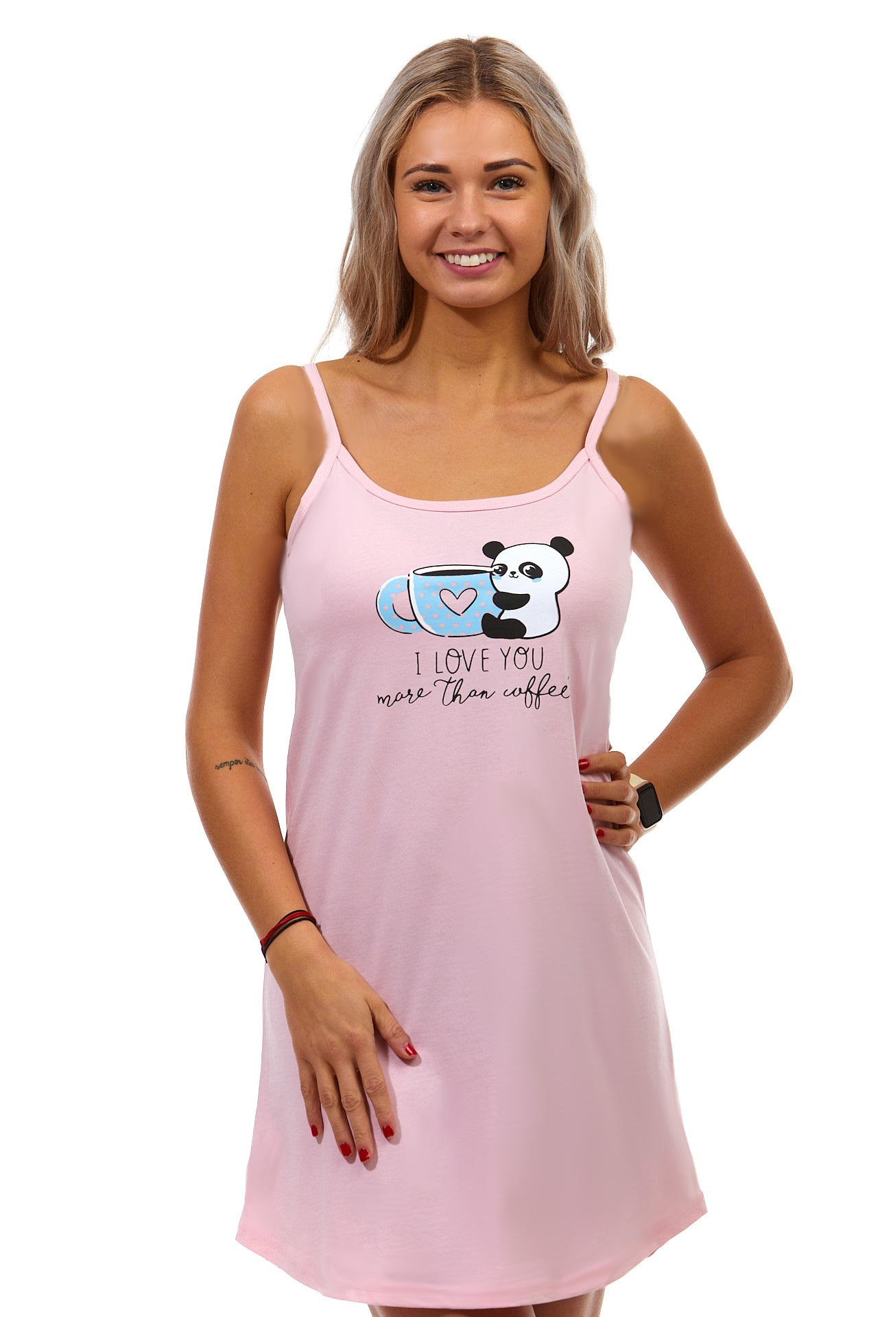 Růžová dámská košilka s tenkými ramínky Ranní kávička nebo kakao s Pandou