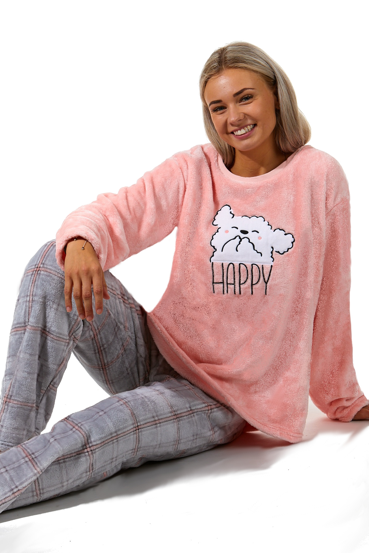 Růžová i šedá károvaná extra teplá souprava na zimu pro plnoštíhlou ženy HAPPY bílý pejsek, big