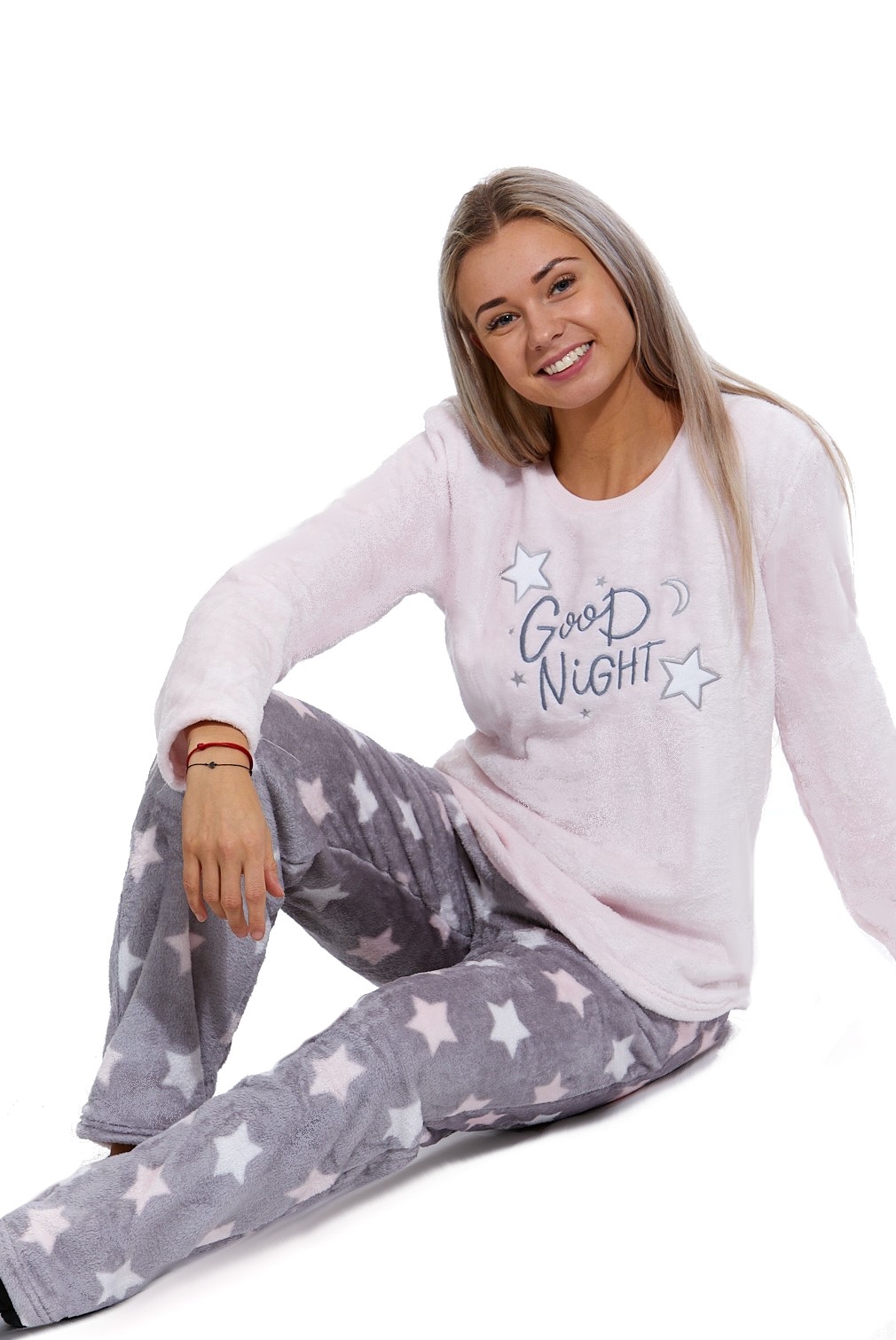 Růžové i šedé hvězdičkové extra teplé huňaté pyžamo na zimu pro ženy GOOD NIGHT