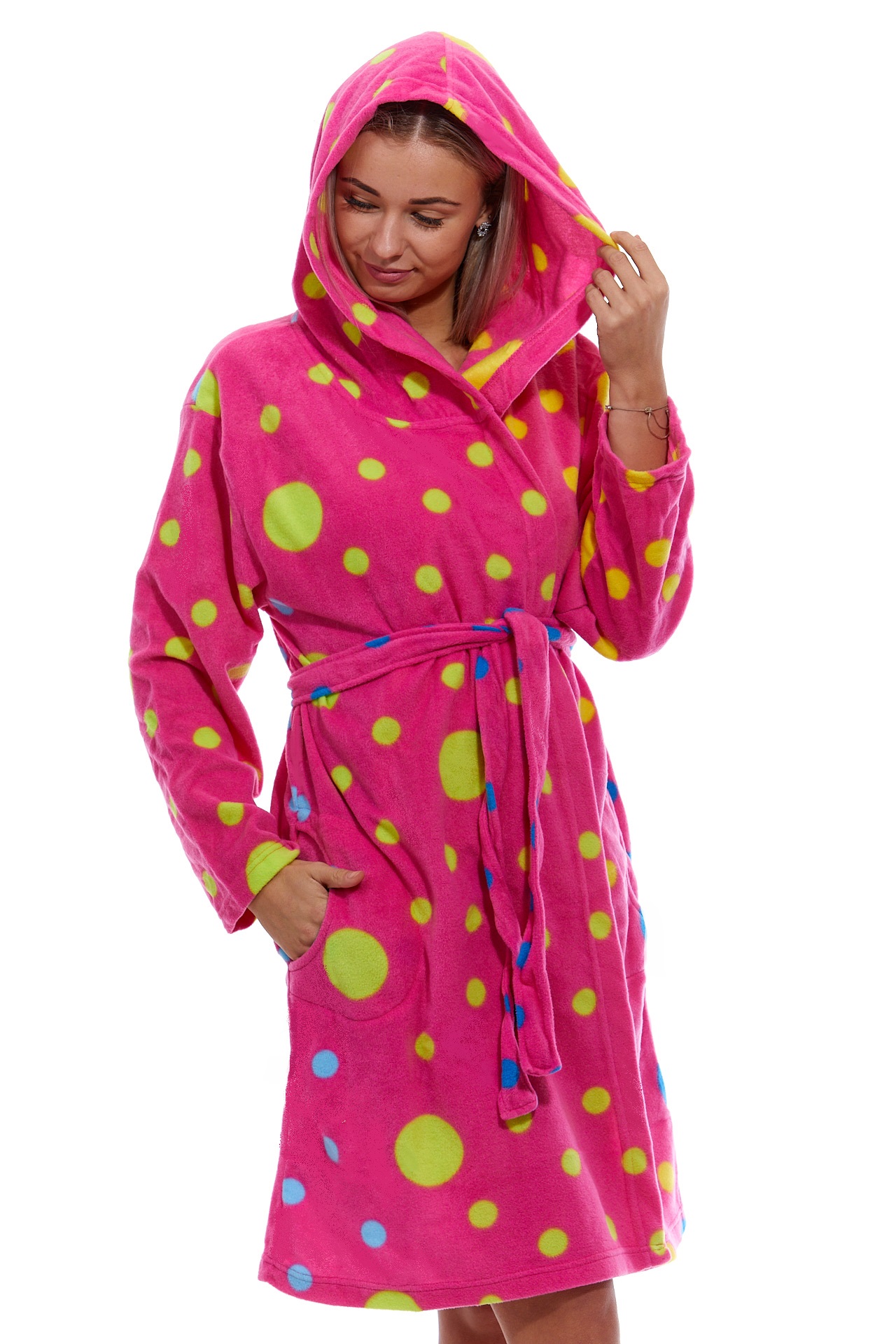 Růžový hřejivý župan pro plnoštíhlé ženy i slečny DUHOVÉ PUNTÍKY